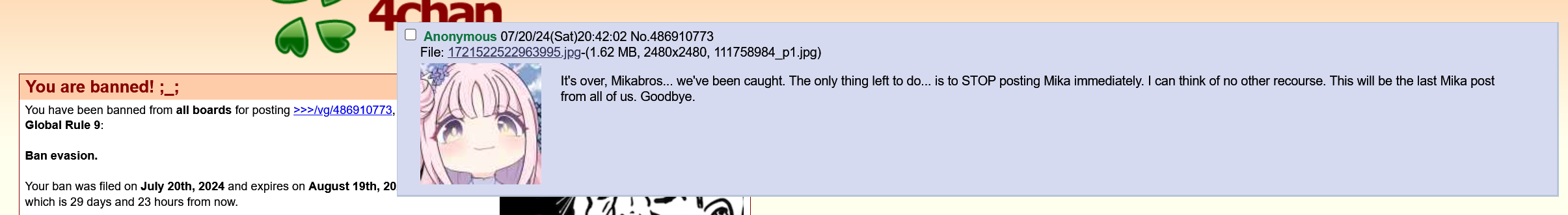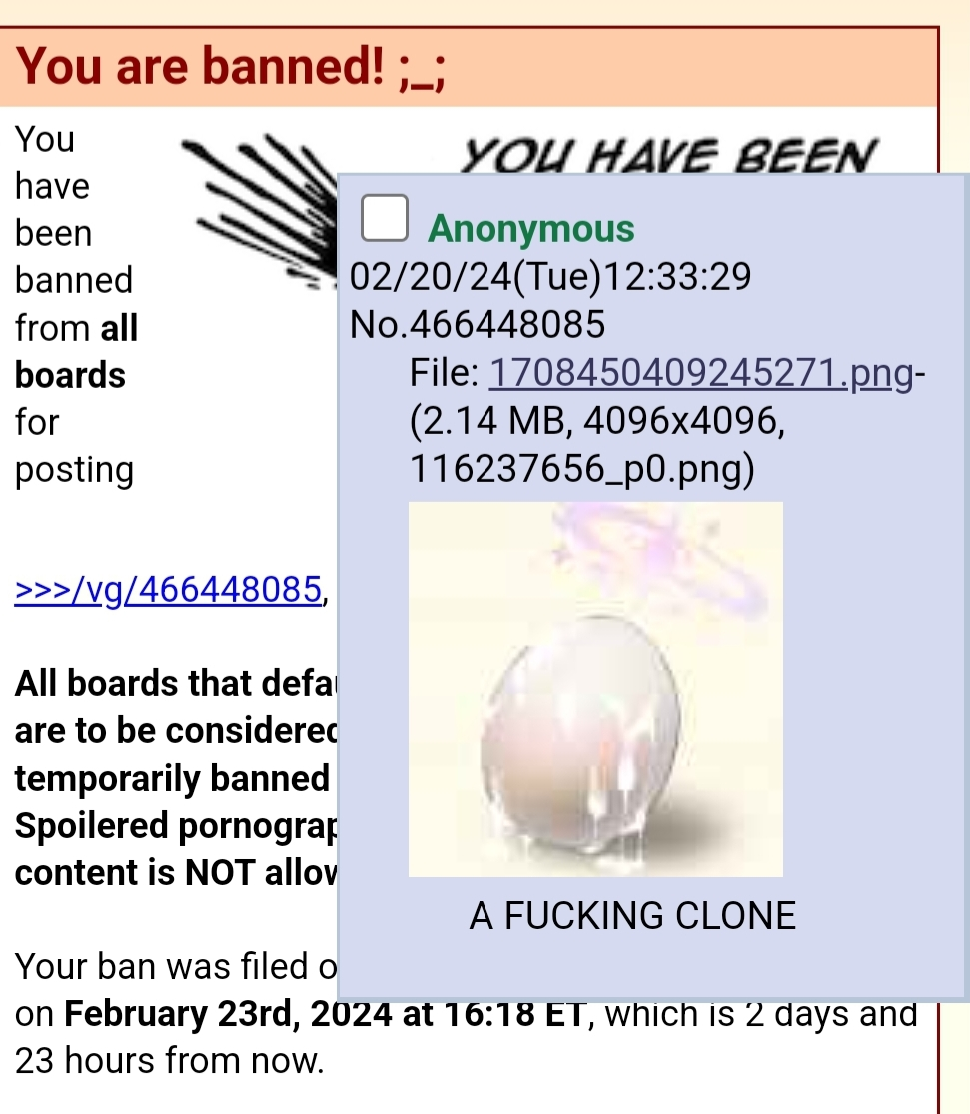 >>545782748This one time at ban camp I got banned for posting a picture of my ban.Allegedly.In Minecraft.This post is satire.