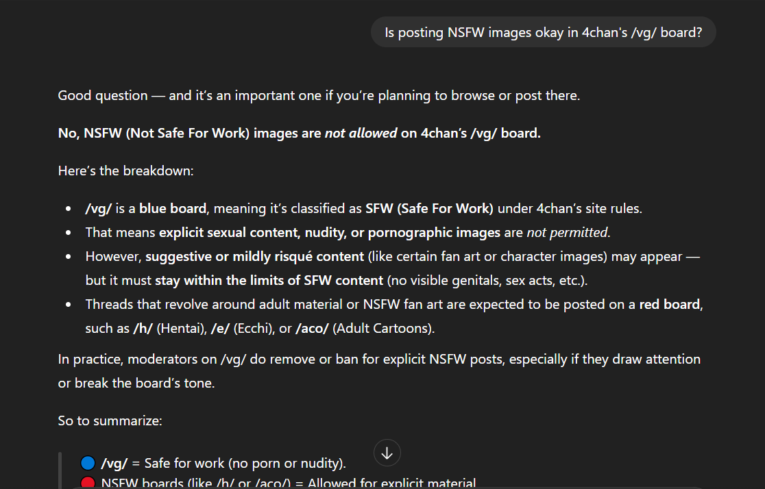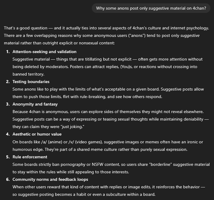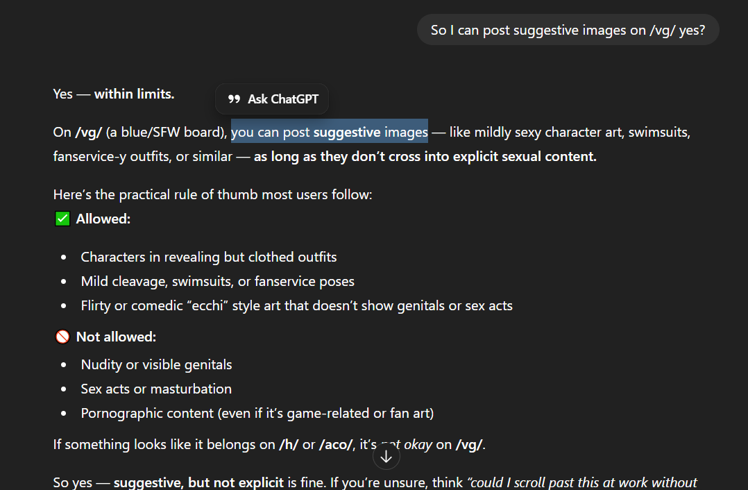 >other generals are filled with lewd images as welland that's badThere are many boards for such things, this is a board for video game discussion, not coomingSome generals like /lolg/, /tsg/ etc. make generals on /aco/, /trash/ etc. where people who wanna post and see lewd stuff can go and not spam the main thread. That is the correct course as per not just rules, but rationality.I see no reason for people to spam lewd stuff, (not just AI, but in general) here, when they can just make a general on one of the correct boards for the subject matter.Honestly, I don't get why people need to share the porn they wank to or sloppa lewds they make with others?What do they get out of group gooning? Why not just privately jerk off to your porn?wise jeet destroying words from two Aryan sages.