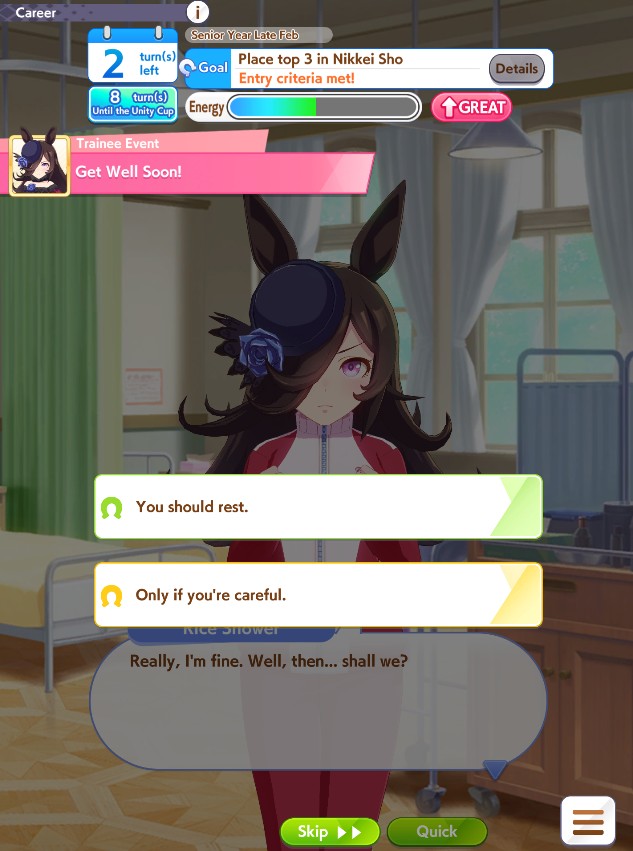 Previous: >>545845406>Global Game NewsCurrent Scenario: Aoharu Hai aka "Unity Cup"Current Specials Missions: Half Anniversary Part 2+3Current Rate Up: Matikanefukukitaru (3* Alt), Riko Kashimoto (SSR), Rice Shower (SSR)Current CM: LEO CUP - Hanshin 2200m11/11 - Balance Adjustments AKA Umamusume 2https://umamusume.com/news/100040/https://pages.snep.pw/uma/anni-skill-changes/11/13 - Legend Races11/16 - VIRGO CUP - Hanshin 1600m11/24 - Story event>JP Game NewsCurrent Rate Up: Transcend alt (3*), SSR Tokai Teio (Speed), SSR Hoshina Kiyoko (Pal)New Scenario "Yukoma Hot Spring" releasedTimeline: https://uma.moe/timeline>IP NewsUmamusume Cinderella Gray 2nd season started weekly airings on 10/5>Thread Clubshttps://rentry.org/globalclubsumaYou must be E3 (20k points) to join a circle. Apply with /uma/ or /vg/ in your profile or post ID in the thread.>All Guides & Resourceshttps://rentry.org/uma26Game databasehttps://gametora.com/umamusume (Click the gear to switch between JP / global server info)A basic guide for newfagshttps://rentry.org/umaglobalFind networks if your region is blocked from the game or clienthttps://www.umavpn.top/93Seiyuu & Concertshttps://rentry.org/umst/uma/ POG (Paper Owner)
