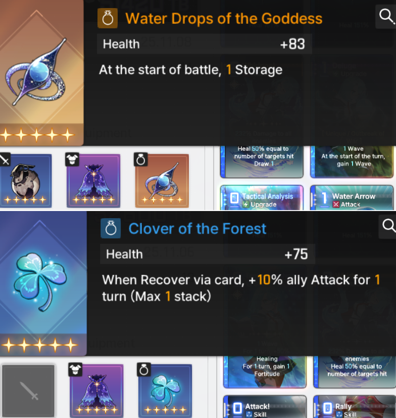 >>545883198Seems like you got your teams covered, Rei solo sustain might be a little cope for Zero System though, dont be afraid to play something like Rei/Mika/Kayron if you need the clear.Speaking of Zero System, I'll give you some tips as well: when you first merge a world which chaos you choose will stick with you and keep scaling in level until you fail. The recommended method is to avoid hard debuffs like no rest, discard 1, max health debuffs, and dont do Nightmare until you reach chaos 9/10As for which Chaos to choose:Chaos 1 I avoid it like the plague because it has the most run enders, and the final boss is a "Did I find the Rally skill from the shop?" checkChaos 2 It's full of AoE, and its a Khalipe check, you can do it since you have KhalipeChaos 3 Shill card spam units like Kayron/Tressa, do beware of the Normal battles at the end you might run into the dog man. This one do offer the good mythic gears for Mei Lin, Tressa and supports (Mulligan armor)Chaos 5 Playground for Beryl/Haru, I find this one the easiest and farmed this to chaos 10 with my Beryl. The gears are kinda sad however since they're all anti shieldsChaos 4 Personally I feel like this one is a harder version of Chaos 5, its the same shield spam shenanigans, but they deal way more damage, however the Elite monster cards and gears you can get from this are CRACKED>>545884139Chaos 3 has her best Mythic weapon>>545884236No u