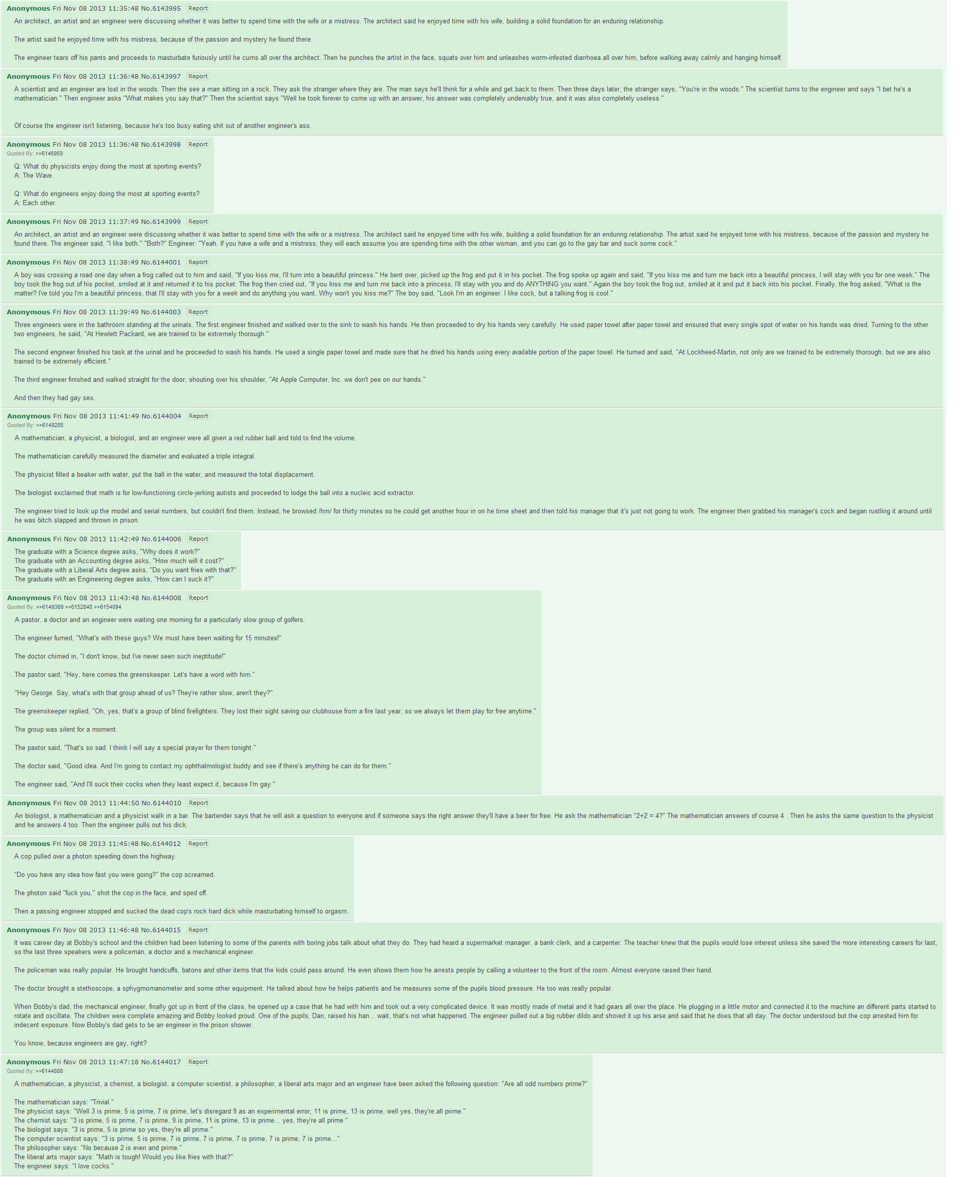 >>546015092>engineering finessefunny way to say "brainless spaghetti that will need to be completely torn out and rebuilt due to a lack of flexibility for mistakes, upgrades, additions, changes, etc."although now i'm curious, since i've heard this kind of talk before from a schizo faggot, do go on and show us examples of your "engineering finesse"