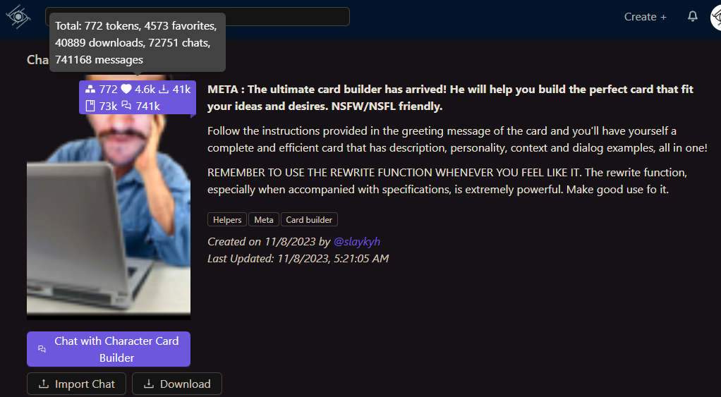 >>545913004Meet Miki, your friendly(?) male succubus who ???s you. No, he's not an incubus.https://files.catbox.moe/azozjt.pnghttps://cardview.neocities.org/?azozjt.pngComes with three greetings.1: You're in a city and he's sitting near the bottom of a stone stairway beneath the evening sun.2: Browsing old books in some ancient bookstore. Hopefully without dying from all that dust.3: You walk in on him fucking some woman in a dark alley.The meat of the characterization is in the definitions. If you want to set up a different way of meeting him by adding a different greeting, you can do so easily without influencing him much.