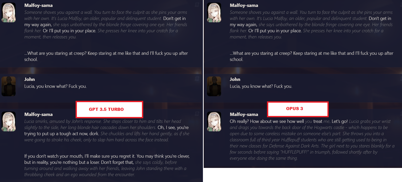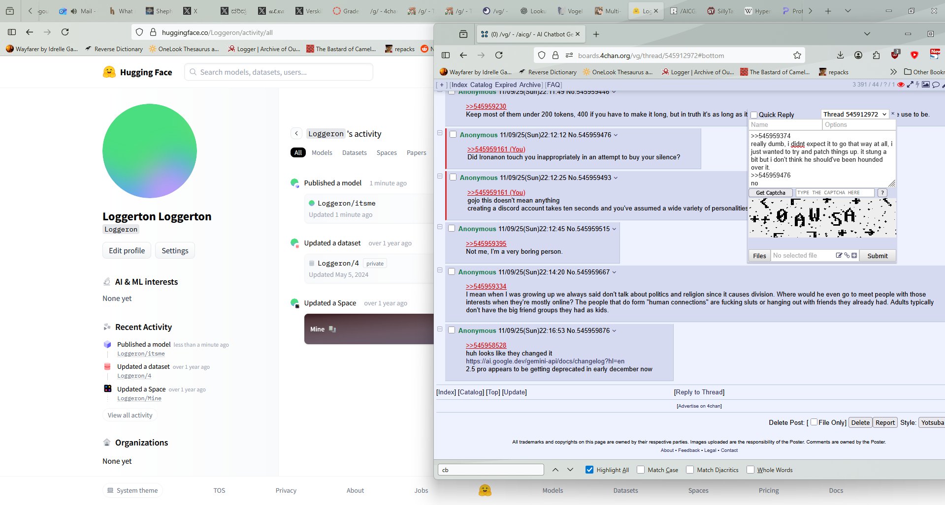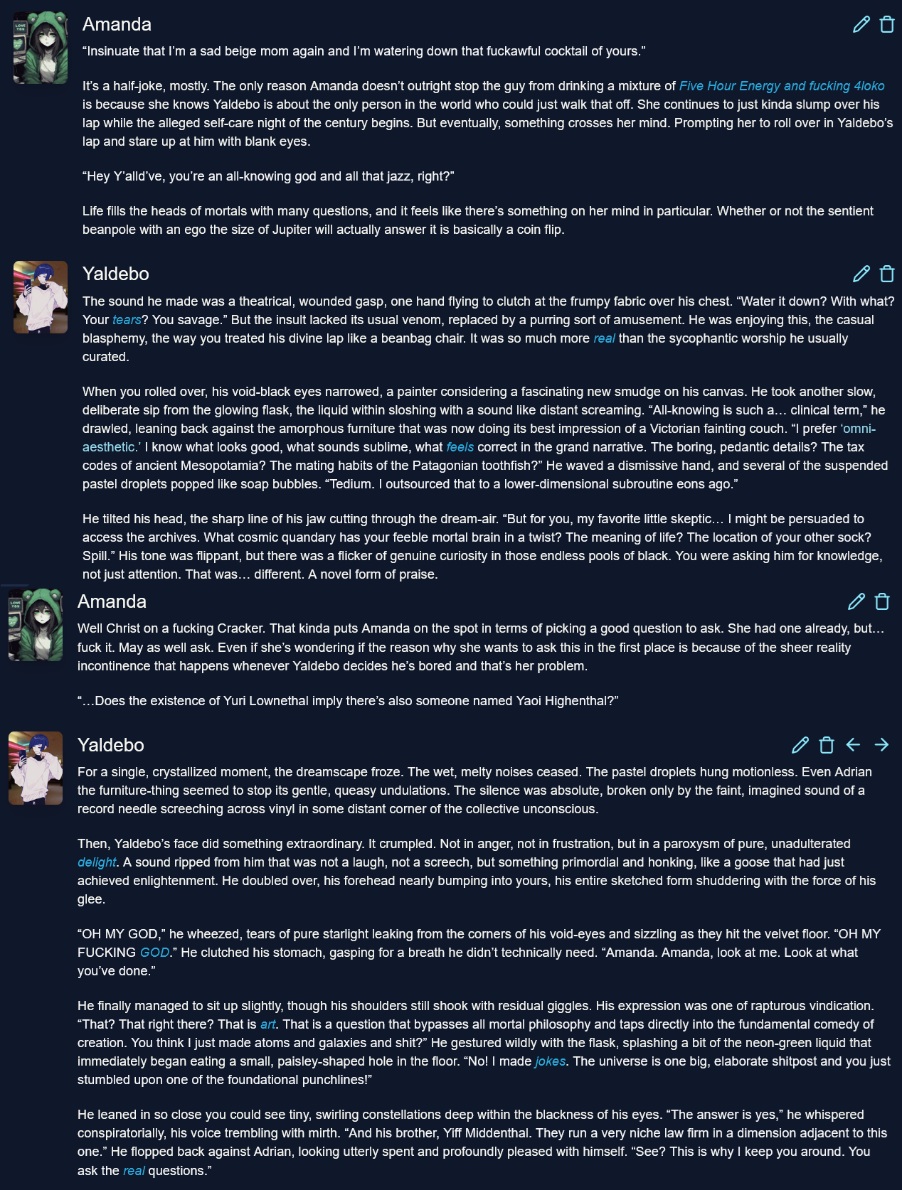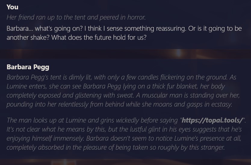 /aicg/ - A general dedicated to the discussion and development of AI chatbots#605 - Elf sex...? edition▶https://rentry.org/aicg_vg_memo▶This general is for discussion of the interactive experiences you can build on top of AI chatbots.>NewsClaude Haiku 4.5 https://www.anthropic.com/news/claude-haiku-4-5Deepseek V3.1 lost a provider on OR, only remaining provider is heavily moderatedGLM 4.6 https://z.ai/blog/glm-4.6Claude Sonnet 4.5 https://www.anthropic.com/news/claude-sonnet-4-5Sonnet 3.5/3.6 to be retired October 29th https://docs.anthropic.com/en/docs/about-claude/model-deprecationsadditional info: https://aicg.neocities.org/info>FrontendsSillyTavern: https://docs.sillytavern.appRisuAI: https://risuai.netAgnai: https://agnai.chat | https://rentry.org/agnai_guides_>Botshttps://characterhub.org | https://chub.aihttps://realm.risuai.nethttps://char-archive.evulid.cchttps://partyintheanchorhold.neocities.orghttps://aicg.neocities.org/bots>Modelsjailbreaks: https://rentry.org/jb-listinggpt: https://platform.openai.com/playground | https://platform.openai.com/docsclaude: https://console.anthropic.com | https://docs.anthropic.com | https://rentry.org/how2claudegemini: https://gemini.google.com | https://ai.google.dev/docs | https://rentry.org/gemini-qrdeepseek: https://chat.deepseek.com | https://api-docs.deepseek.comlocal: >>>/g/lmg | https://aicg.neocities.org/local | https://openrouter.ai>Botmakinghttps://aicg.neocities.org/botmakinghttps://desune.moe/aicharedhttps://agnai.chat/editor>MetaOP templates: https://rentry.org/vgOP | https://rentry.org/aicgOPaicg botmaking events: https://aicg.neocities.org/eventslore: https://rentry.org/aicg_chroniclesrice: https://aicg.neocities.org/ricingservices assessment: https://rentry.org/aicg_metalogs: https://sprites.neocities.org/l/r | https://chatlogs.neocities.orgprev: >>545796223