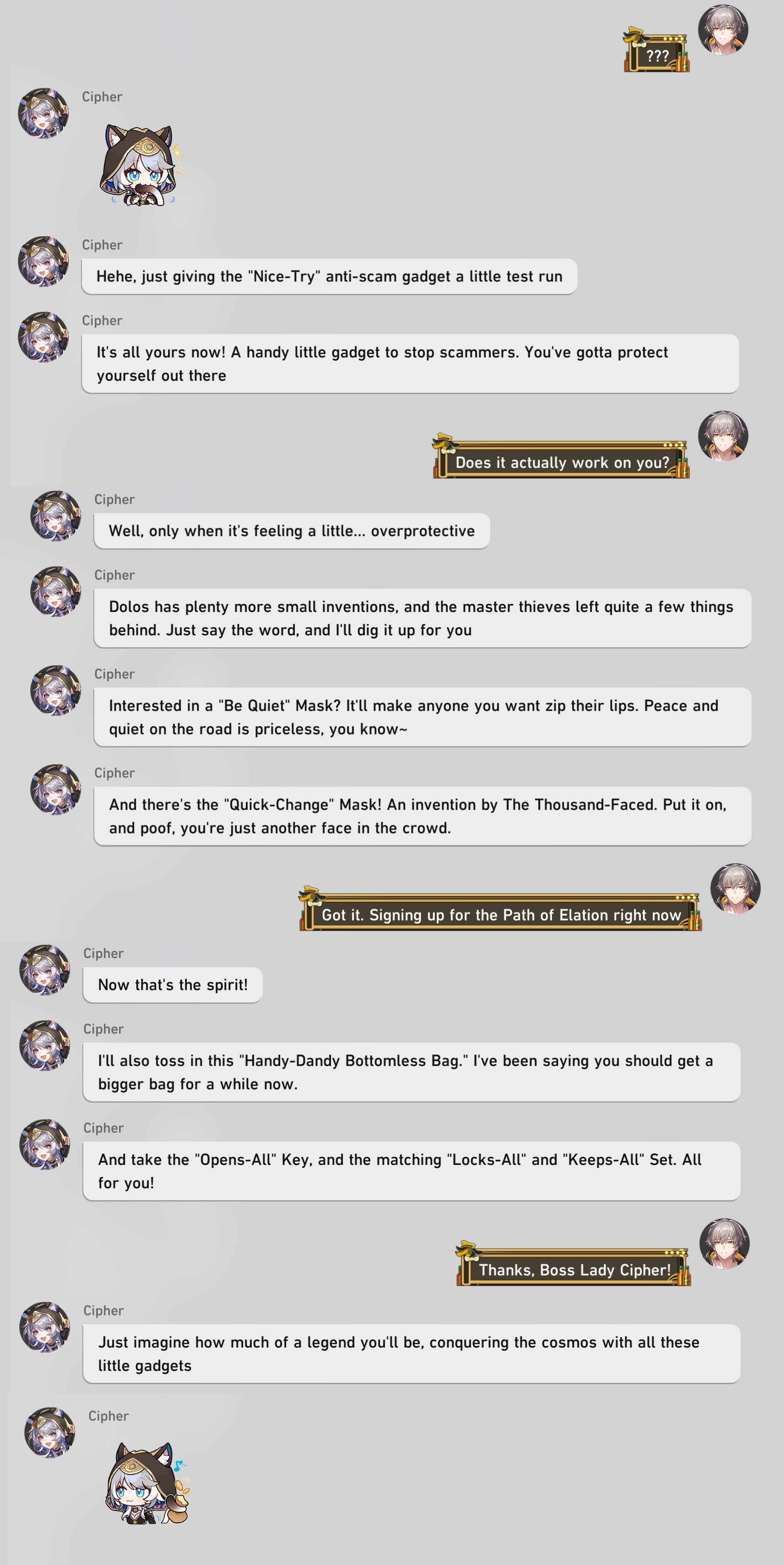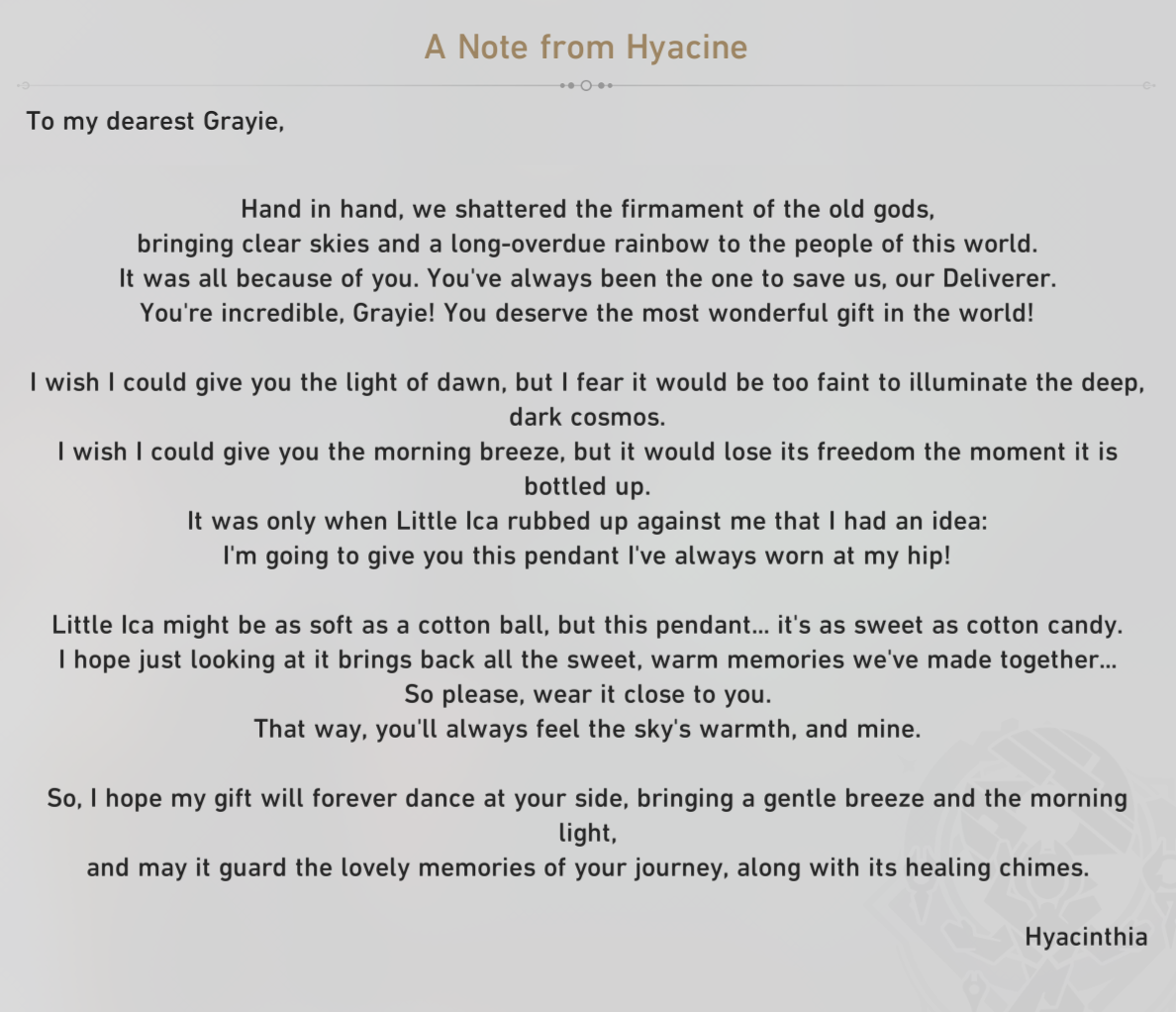 I'm gonna skip 3 patches worth of shit when 4.X comes so can someone tell me if the heirs are aware of Cyrene's sacrifice or talk with or to her in the epilogue page? Well it would make sense if Phainon did since wouldn't he be without a childhood friend?