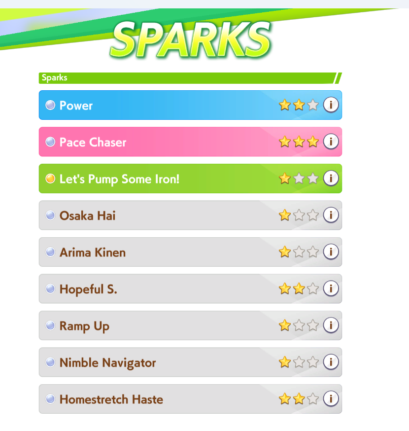 >>545985247Nah you can get away with having a hodgepodge of sparks now. The main reason having matching sparks was so important in URA was because stam sparks were just THAT strong in that scenario. Pretty much everyone other than goldship wanted as many stam sparks as possible. So naturally that meant borrowing a 9* stam parent. 9* power borrows were strong too, but they were niche. Mainly for Sprint and mile, and even then, 6* power and 3*stam or 3*power 6*stam were basically just as good.But now that speed sparks and power sparks are basically just as good as stam sparks, a hodgepodge 3spd 3stam 3power parent is basically just as good as a parrent with 9* in either spd, power, or stam.Because of how the bubbles work, the sparks can be pretty much anything other than wit (although guts is still undesirable). You just gotta match your bubble popping priority to your sparks/deck/growth rates.However it really sucks that the first CM of Aoharu is Mile. Since we are still hot off the URA meta, the borrow market is still flooded with 9* stam parents, so its harder to get the sparks I want. Like I implied earlier, I dont like how I'm stuck using a 9*stam borrow for my Ryan right now.