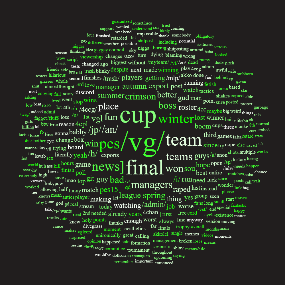 Previous: >>545922724>What... is this?Put simply, a simulation of Pro Evolution Soccer being competed between teams which are embodiments of boards of the 4chan imageboard. The players represent facets of each board's culture. All of the matches are AI versus AI. However, humans "manage" each team, creating their tactics and giving input during games as they happen to make substitutions and tactical changes as they see fit.https://implyingrigged.info/wiki/FAQ>Where can I watch the cup?https://isthisliv.com/4cc/stream.html>Upcoming Cuphttps://implyingrigged.info/wiki/2026_4chan_Winter_Cup>Upcoming /vg/ Leaguehttps://implyingrigged.info/wiki//vg/_League_25>Upcoming Invitationalshttps://implyingrigged.info/wiki/Divegrass_Before_Christmas_6:_This_can%27t_wait_a_month>Wiki:https://implyingrigged.info/wiki/Main_Page>Sekkrit Code37pebis>DLC Passworddivegrass>Booruhttps://isthisliv.com/booru/>Other videoshttps://implyingrigged.info/wiki/Videos>PES Infohttps://implyingrigged.info/wiki/Pro_Evolution_Soccer_2015>Sister thread>>>/trash/79120263>Autieshttps://forms.gle/d4ZnYsG2fwoMUepT9>PreviouslyIt's over for autumnshitposting