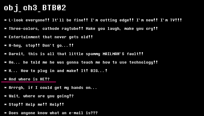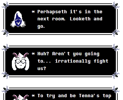 >>546048110>mettaton assumes susie is mentally threeHave you seen her spelling? That's an accurate assumption. Also she's talking about a TV like it's a real person, if anything he's being generous by assuming she's just retarded and not batshit insane.