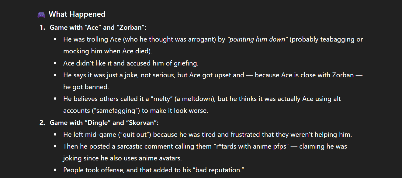 Can I ask why am I blocked?First things first, I remember arriving here a few weeks ago from zorban's chat, I already knew 4chan from years ago, and when I saw the erg password, it rang a bell that he could be talking about /vg/, because that's how people formated the general's names, then, I had some really normal games with people here, no big deal. One day I started sniping zorban and I got into a game with him and ace, now, ace was known for being cocky and a jerk to some people in the chat, like some innocent chatters would come by and he'd start trolling them with some bullshit, so I thought I would give him a funny lesson by pointing him down everytime he died, I didn't mean to come off as a griefer, now, I think he really flipped the fuck out of because of this, because he made a huge scene of how that was really uncool, and that it was too far the moment it was griefing, like, who gives a shit it's just a game, the worst part is that we won that game anyway. I got called out and I was like "I was just joking don't be so serious" and got banned because ace is zorban's buddy, everyone called this a melty, but I'm pretty sure it was just ace samefagging and we all know that's just a buzzword for when you disagree with someone pretty much. Second, I quit out from a game with dingle and skorvan, because I really wasn't having it that day, I Was really sleepy and they weren't helping me kill red stuff at all so I got kinda tilted and left, then in the thread I posted like "Oh of course those r*tards had anime pfp's" and this was considered super mean or something, I was of course being sarcastic because I also have anime pfp's and stuff, but that wasn't such a big deal, no more than you all insult each other daily honestly. But I really don't remember having any more arguments with people here to deserve to be blocked? The secret Discord members really hate my guts or something. Cont--