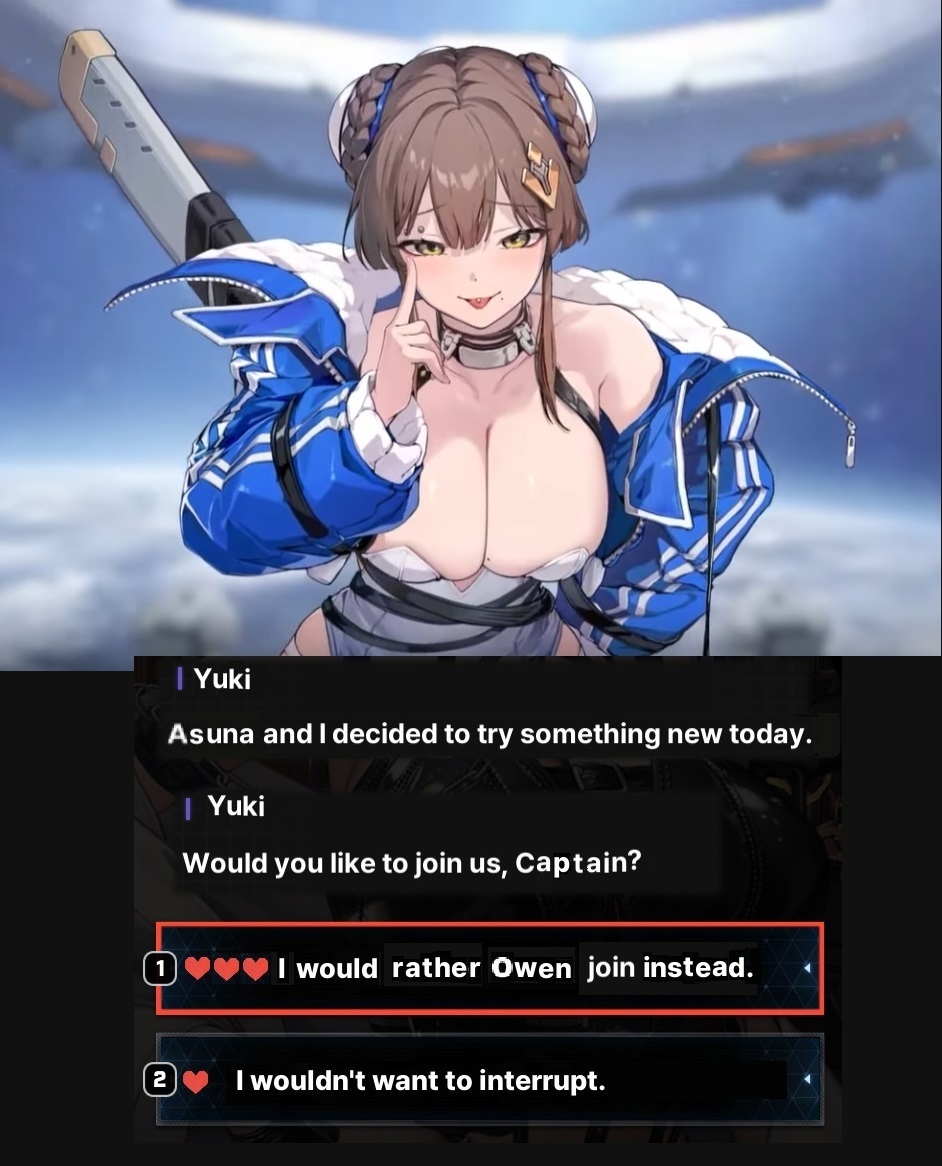 >>546035428Unironically Kayron.Sending niggas to the event horizon is very cool.I really like Mei Lin and Renoa too though.