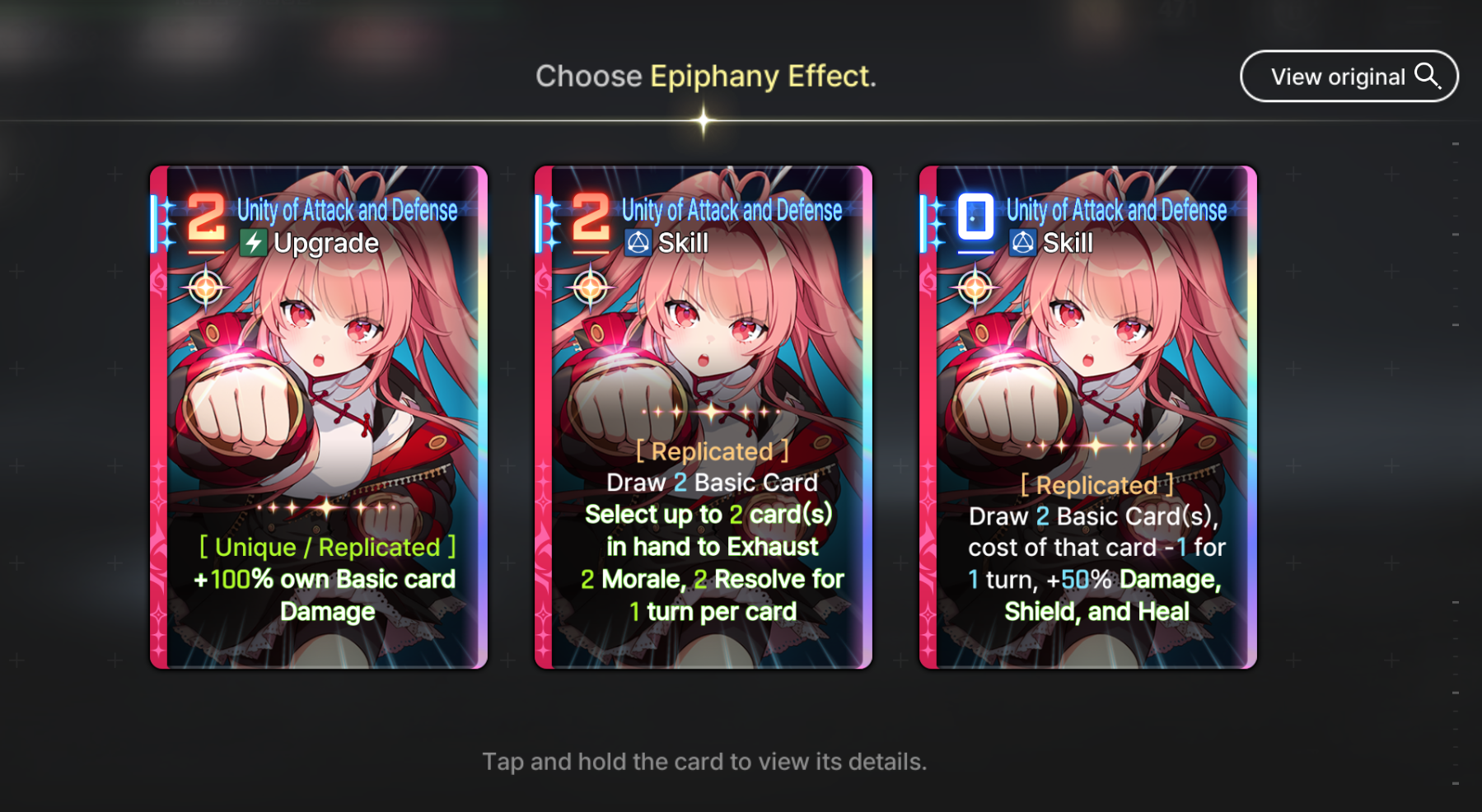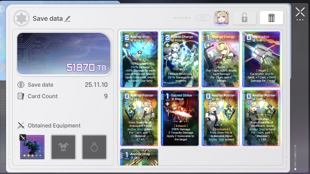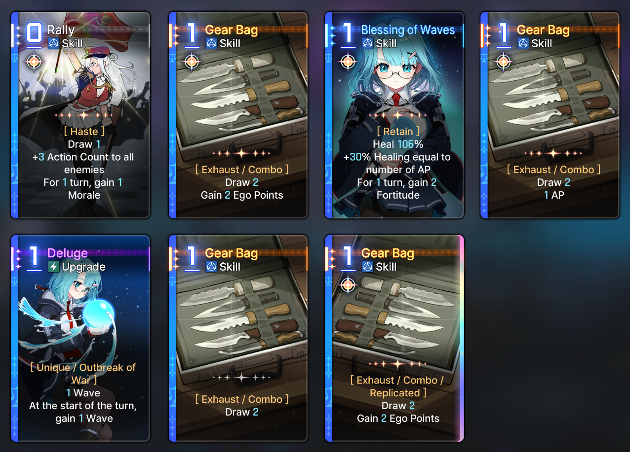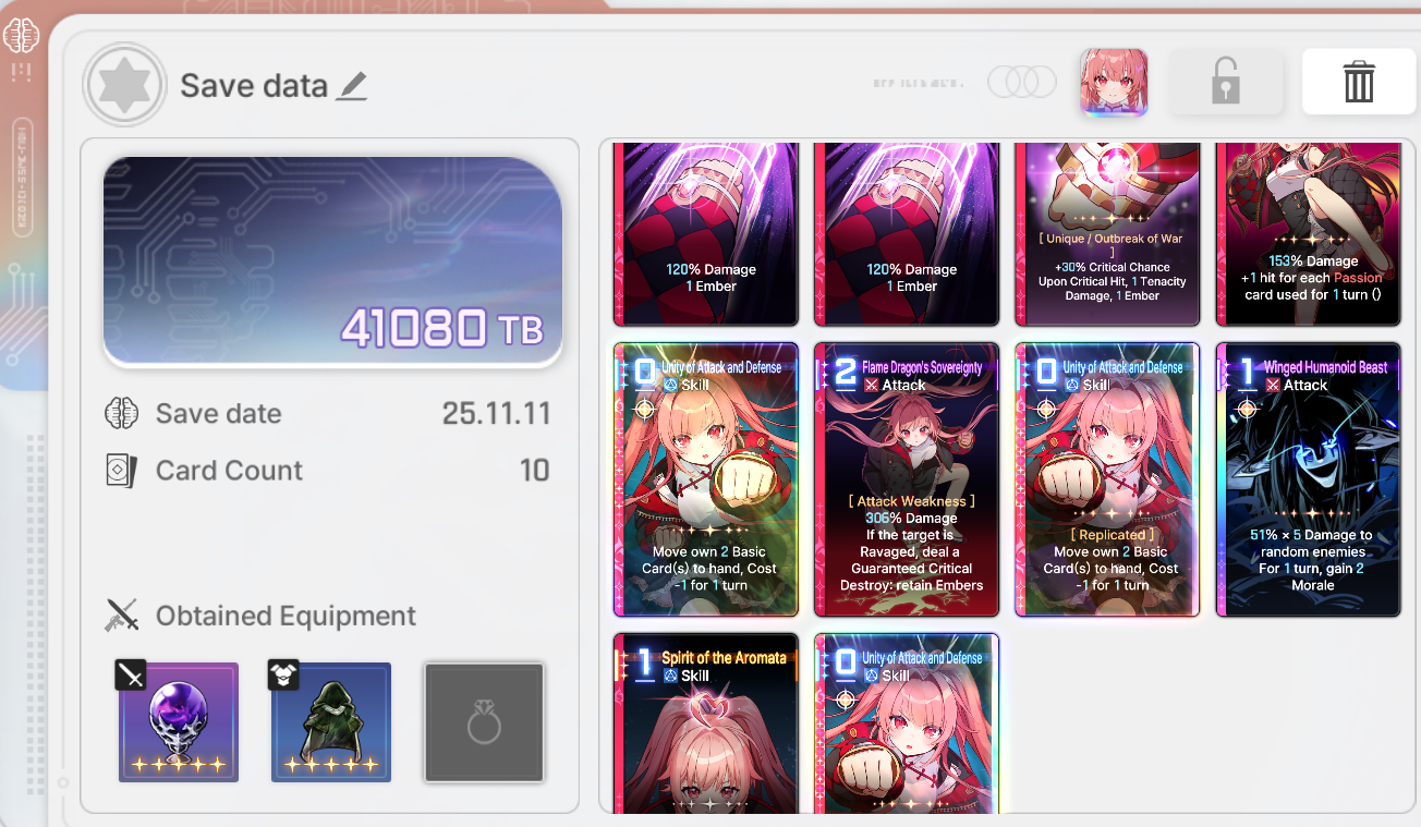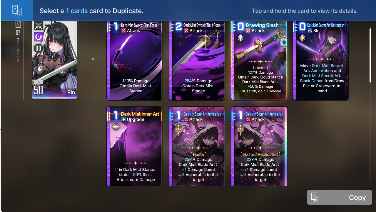 The rng of this game is beyond disgusting, coupled with the time it takes to even farm said rng and i'm quickly reminding myself why i quit E7.>Most epiphanies exist solely to ruin your deck building because they are straight up bad compared to the best ones>The copy system is utter dogshit, not only do you need to epiphany a card before replicating it but you also need to beg the game to let you copy the right cards out of 3 cards for most of the copy events in a run>Then you have the gods blessings rng>Then you have the equipment rng>Then you have the neutral cards rng>Then you need to beg the save data system to not null and void all of the rng above>On top of the rng in the runs the game has a shitty fragment system from E7/hoyoshit, something that alone is enough to make most players of those games lose their minds>And the cherry on top is the genshit gacha systemThis game is getting pvp leaderboards very soon btw.