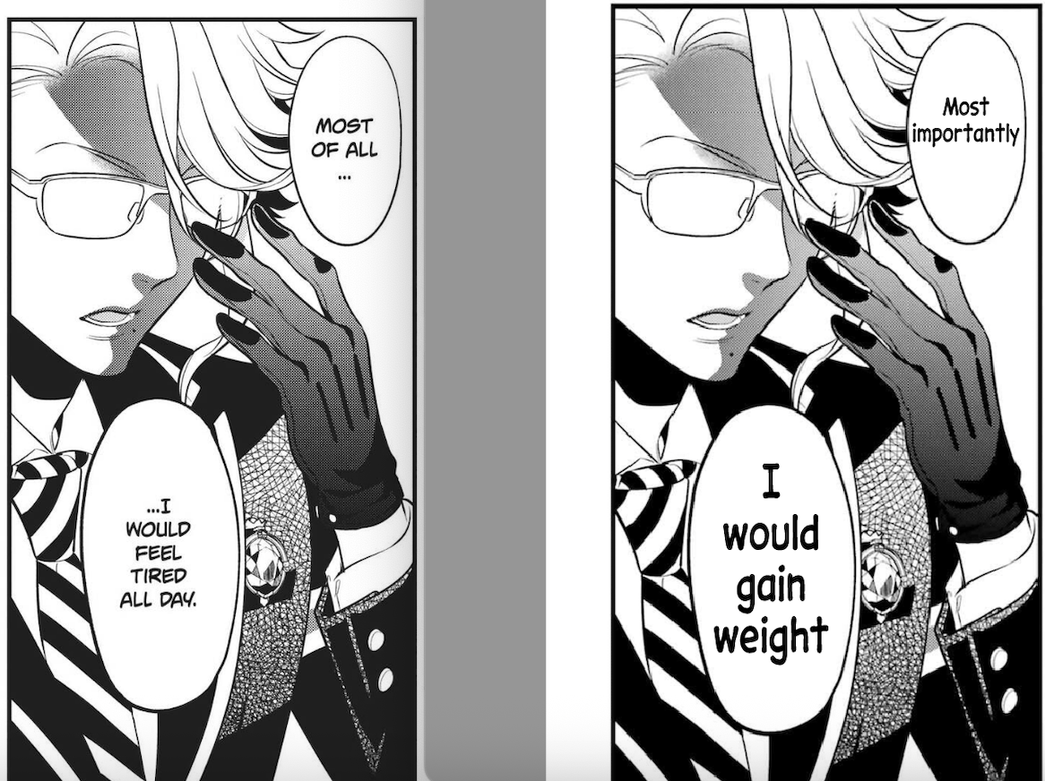 >>548286270Nah they kept red bean bread in the manga because the artist drew a piece of red bean bread and wrote SWEET RED BEAN BUN on it in english. Picture: official en. But they changed Leona's sandwich to cheese because we never see drawn. EN anime and manga and game will reluctantly keep from changing stuff when the visuals/other dialogue don't give them any other choice. Example: Yuuken calling Grim a tanuki. Grim turns into a literal tanuki in that moment so they couldn't change it to weasel even if they wanted to. Same with Floyd's takoyaki. They changed it into corndogs in books 2 and 5 because it was a one-off comment from Grim, but they were forced to keep it in floyd's profile because his first birthday has a whole conversation about making takoyaki and what they are, so they had no choice. Also in the anime, Cater calling Deuce by a nickname. They removed nicknames from everybody else so it looks like he just likes Deuce especially now, because Deuce asks him not to use a nickname with him afterwards, so they had to have Cater call him SOMEthing, they had no choice.It is only when Yana forces their hand that they stay true to the actual story, like when they changed Trey's and Riddle's past and then had to go back in and change it to make it correct to the story 2 years later because it became relevant in Book 7. I will never forgive them for that one.