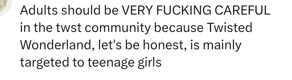 >>548219434I think there's a little more context to jp's reactions, for those who are curious about jp discourse ever since twst started there's a small but loud group of d-otaku over there that are big haters of it and refuse to accept twst is Disney. It kinda got worse this year because apparently the parks there were mostly twst cosplayers. Lots of comments going around like "twst cosers need to get out this isn't ikebukuro", "there should be more princesses bring back real Disney", "the parks should ban twst it doesn't represent Disney at all" etc. These d-otaku were eyeing twst fans at the parks, and complaining online the moment they do something they did not approve of at the parks, like being too loud. Which other people do too. Some twst fans even posted experiences of hearing them openly diss twst fans when waiting in line. That's why there's a lot more jp posts insisting twst is disney