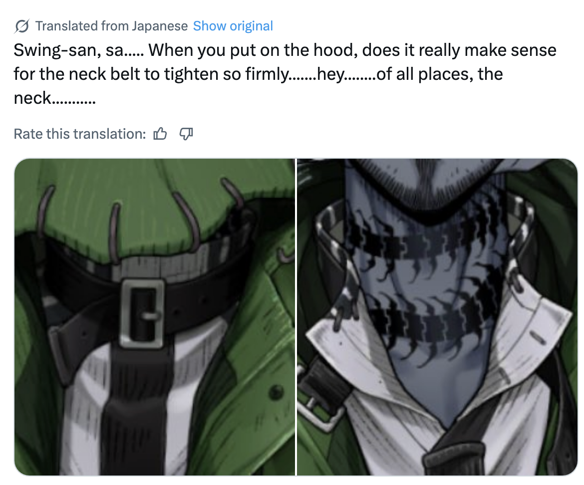 >>548331250But I was talking about the anime, which has no connection to the game's translation, just as the official English subtitles for the anime aren't based on the game's translation, so I'm confused about what they're complaining about, since they were talking about the anime, which probably won't change anything.