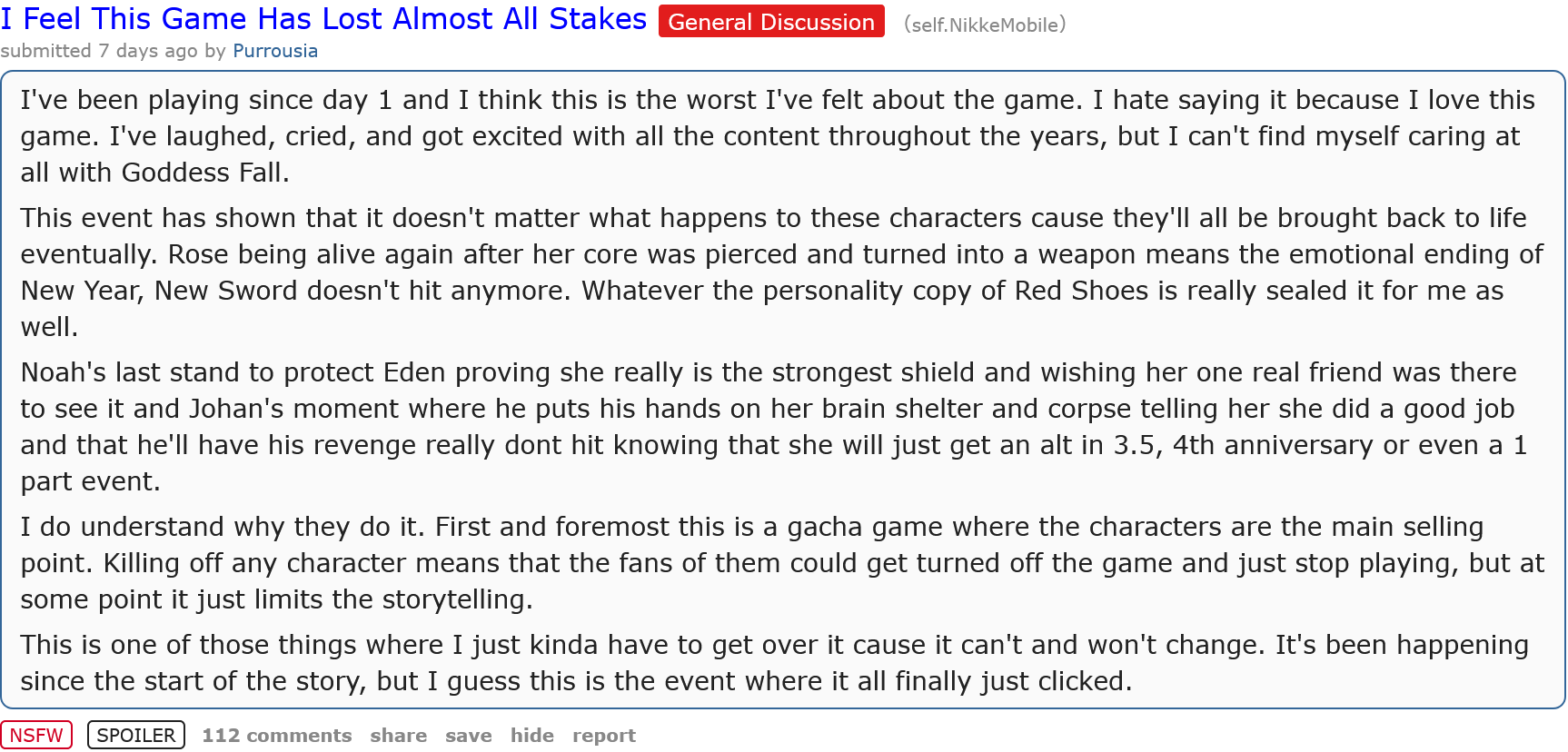 >>546079460>hurrr who cares about a character I don't like? KILL HER!this is the new audience Shift Up wants?