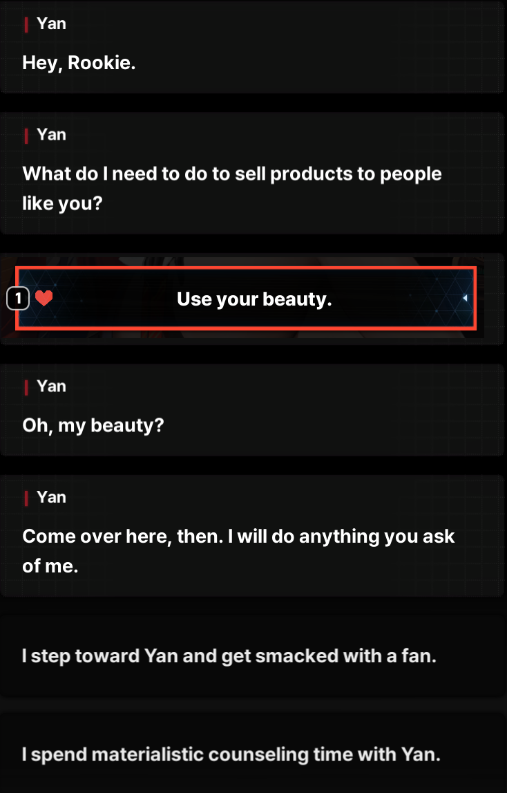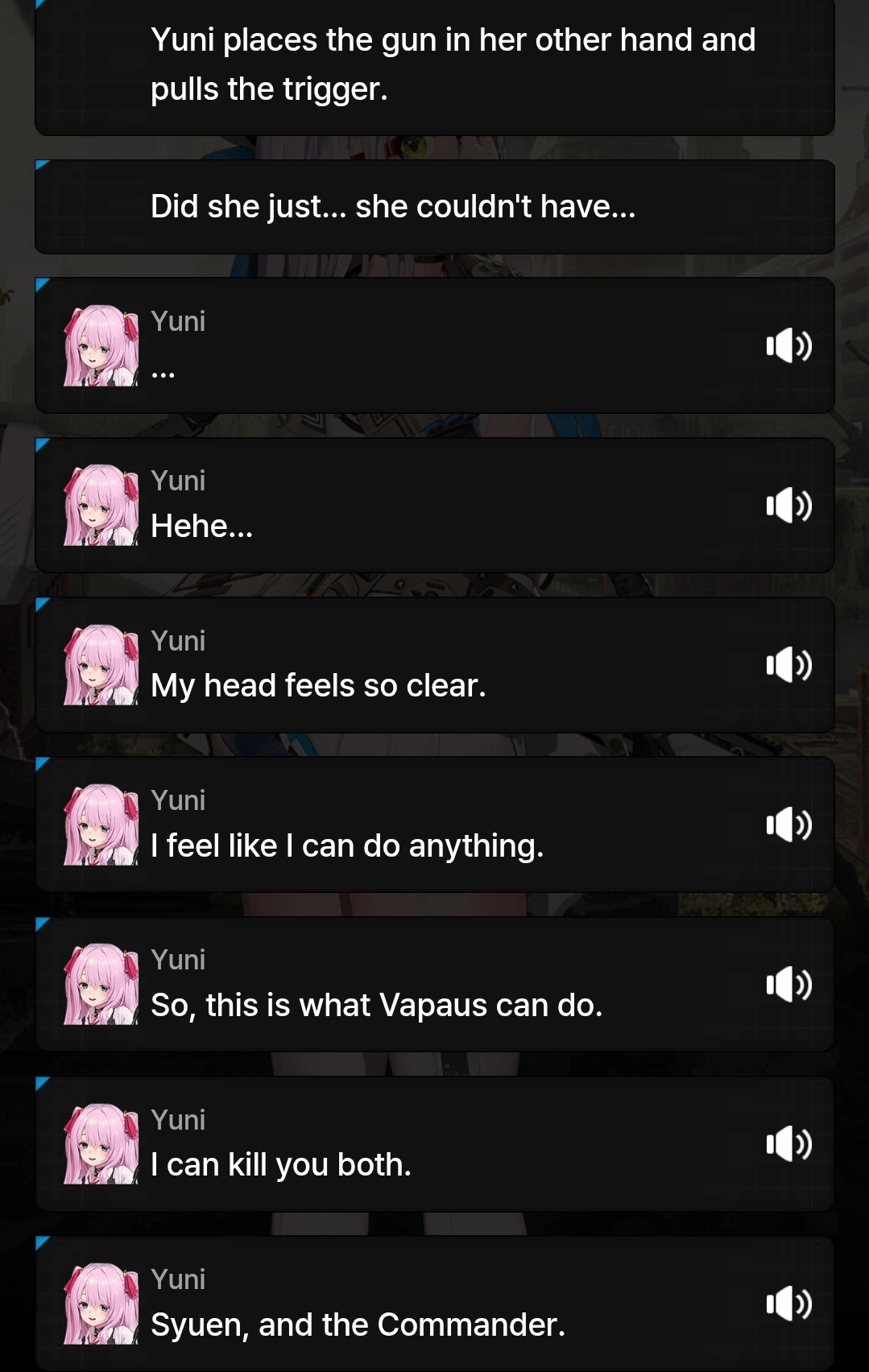 >>546080656I actually expected her to show up in the second half of the event but no. She got very little involvement in anything in the story chapters and zero in the event, and then she goes away. I am/was happy that she turned and the hints of love for us but now I am worried that she will get killed too. If they give her the Nihilister treatment, now that she's playable and has interacted with us she's free for them to torture and kill.