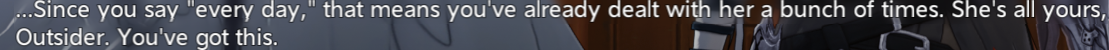 >>546133438I gave up on her really early because I was new and didn't understand how to keep my sanity up on her. I bet she's not so bad if you give her a lot of sanity wedges, but I've already moved on to other characters.