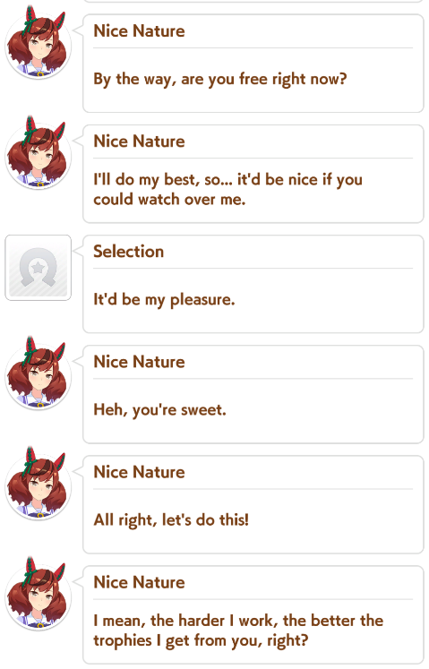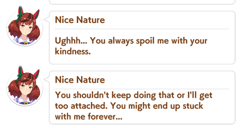 >>546151068Nice Nature and Eishin Flash are, from what Iāve seen, the most āfor youā umas with their blatant feelings for the trainer. Hell, Eishin Flash has you meet her parents and gets the intrusive thought of marrying her trainer.
