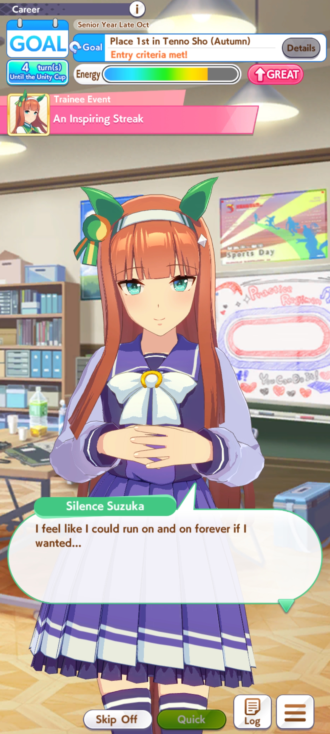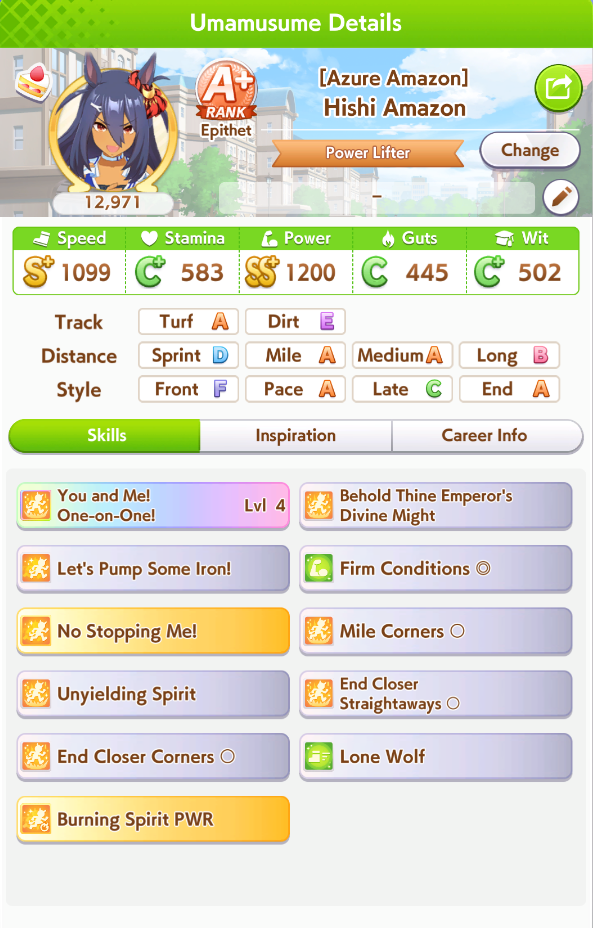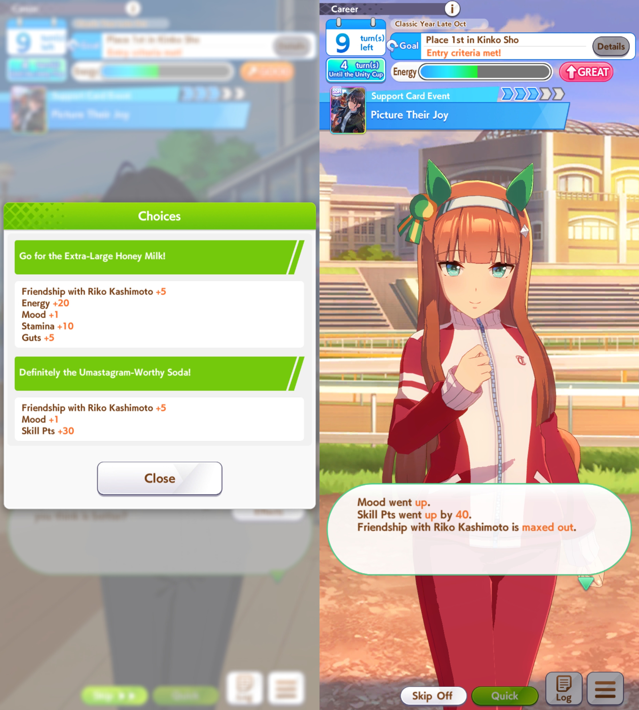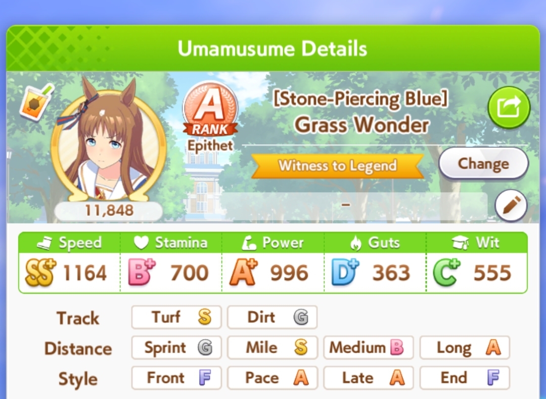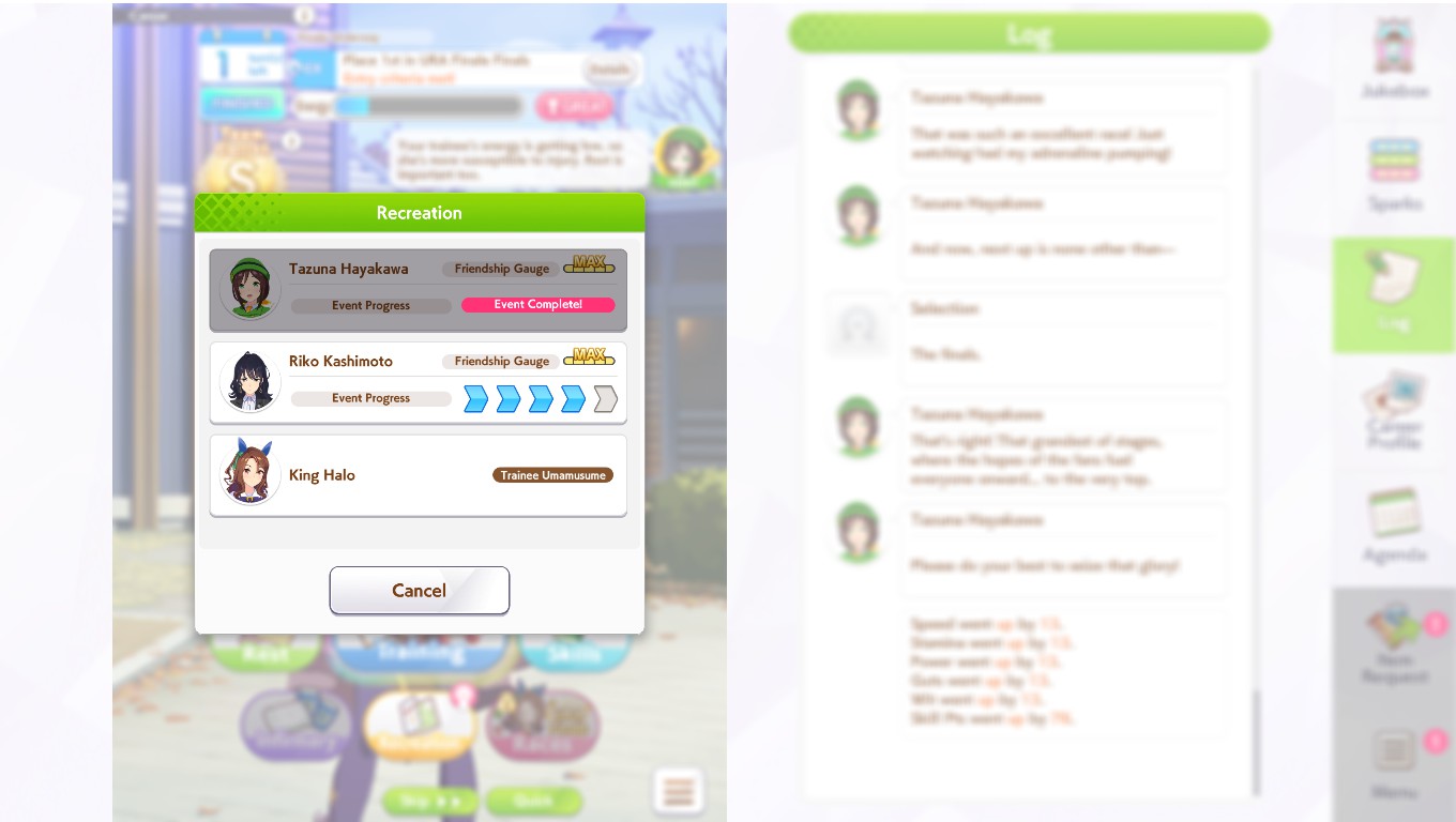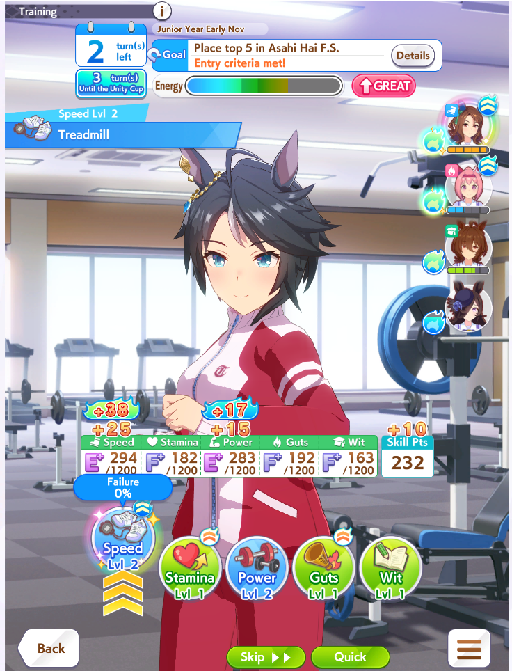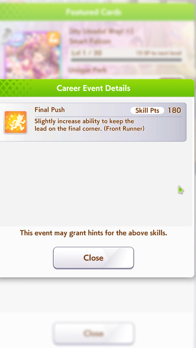 >>546151290Also one of her outfit events has guaranteed charming now or I've just been incredibly lucky to get it 3 times in a row. The free energy/stats event is great and 25 (+racebonus) speed and power for winning an extra G2 and G3 is Nice too.