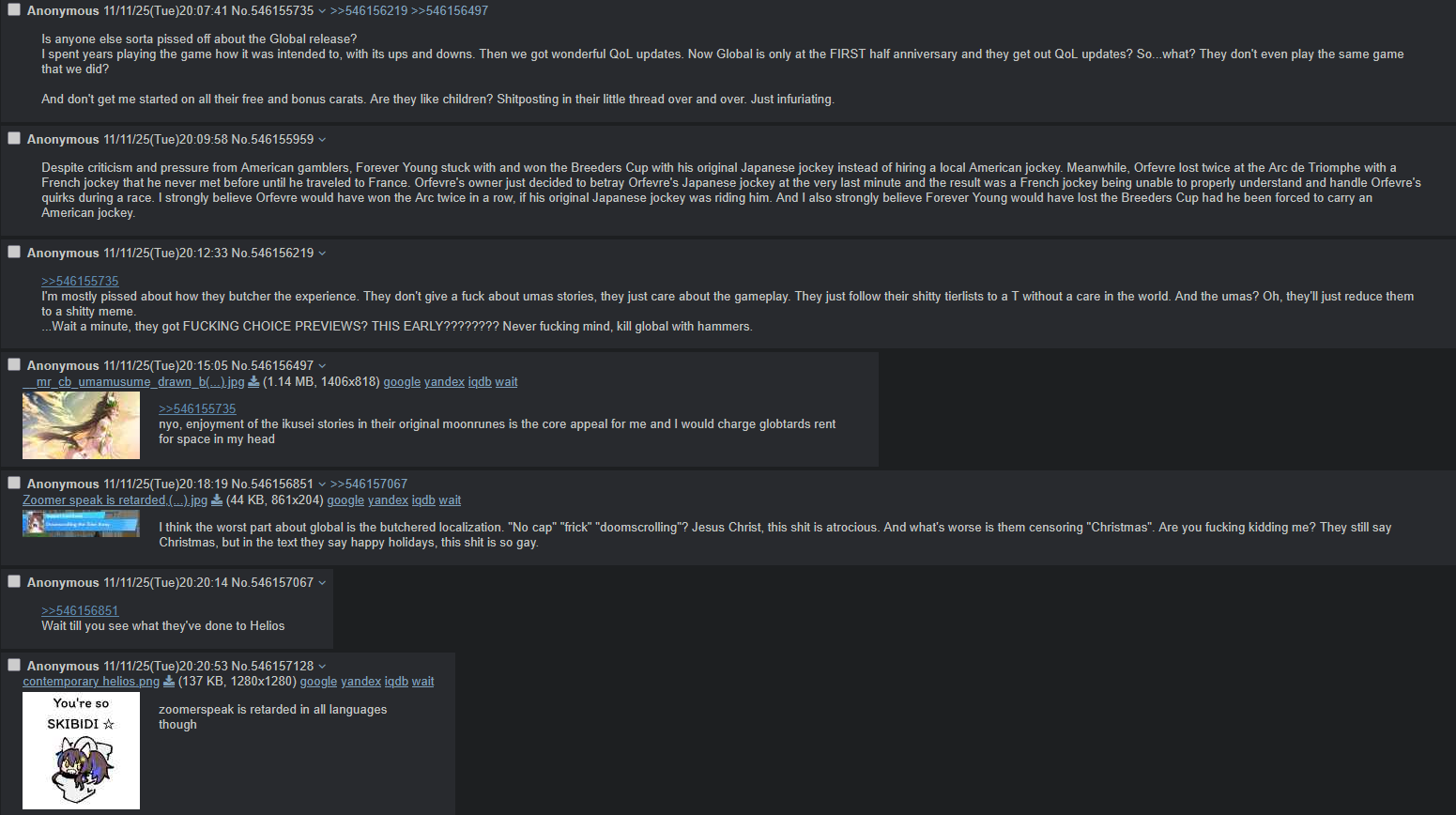 Previous: >>546123778>Global Game NewsCurrent Scenario: Aoharu Hai aka "Unity Cup"Current Specials Missions: Half Anniversary Part 2+3Current Rate Up: Matikanefukukitaru (3* Alt), Riko Kashimoto (SSR), Rice Shower (SSR)11/11 - Balance Adjustments AKA Umamusume 2https://umamusume.com/news/100040/https://pages.snep.pw/uma/anni-skill-changes/11/13 - Legend Races11/16 - VIRGO CUP - Hanshin 1600m11/24 - Story event>JP Game NewsCurrent Rate Up: Wonder Acute alt (3*), SSR Mihono Bourbon (Power)New Scenario "Yukoma Hot Spring" releasedTimeline: https://uma.moe/timeline>IP NewsUmamusume Cinderella Gray 2nd season started weekly airings on 10/5>Thread Clubshttps://rentry.co/umaglobalclublistYou must be E3 (20k points) to join a circle. Apply with /uma/ or /vg/ in your profile or post ID in the thread.>All Guides & Resourceshttps://rentry.org/uma26Game databasehttps://gametora.com/umamusume (Click the gear to switch between JP / global server info)A basic guide for newfagshttps://rentry.org/umaglobalFind networks if your region is blocked from the game or clienthttps://www.umavpn.top/93Seiyuu & Concertshttps://rentry.org/umst/uma/ POG (Paper Owner)
