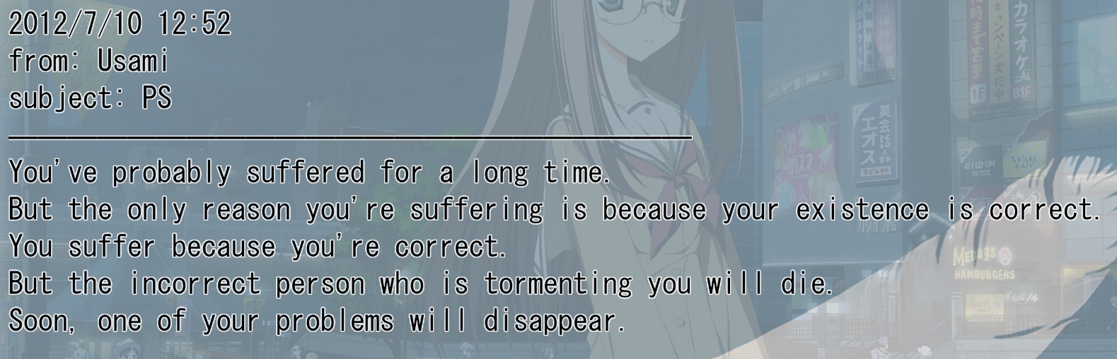 >>546258000>DUDE! it's NVL, no one knows who is talking! but it is clear here that the girl is telling him what his flaws are @_@she clearly cucked him lmao
