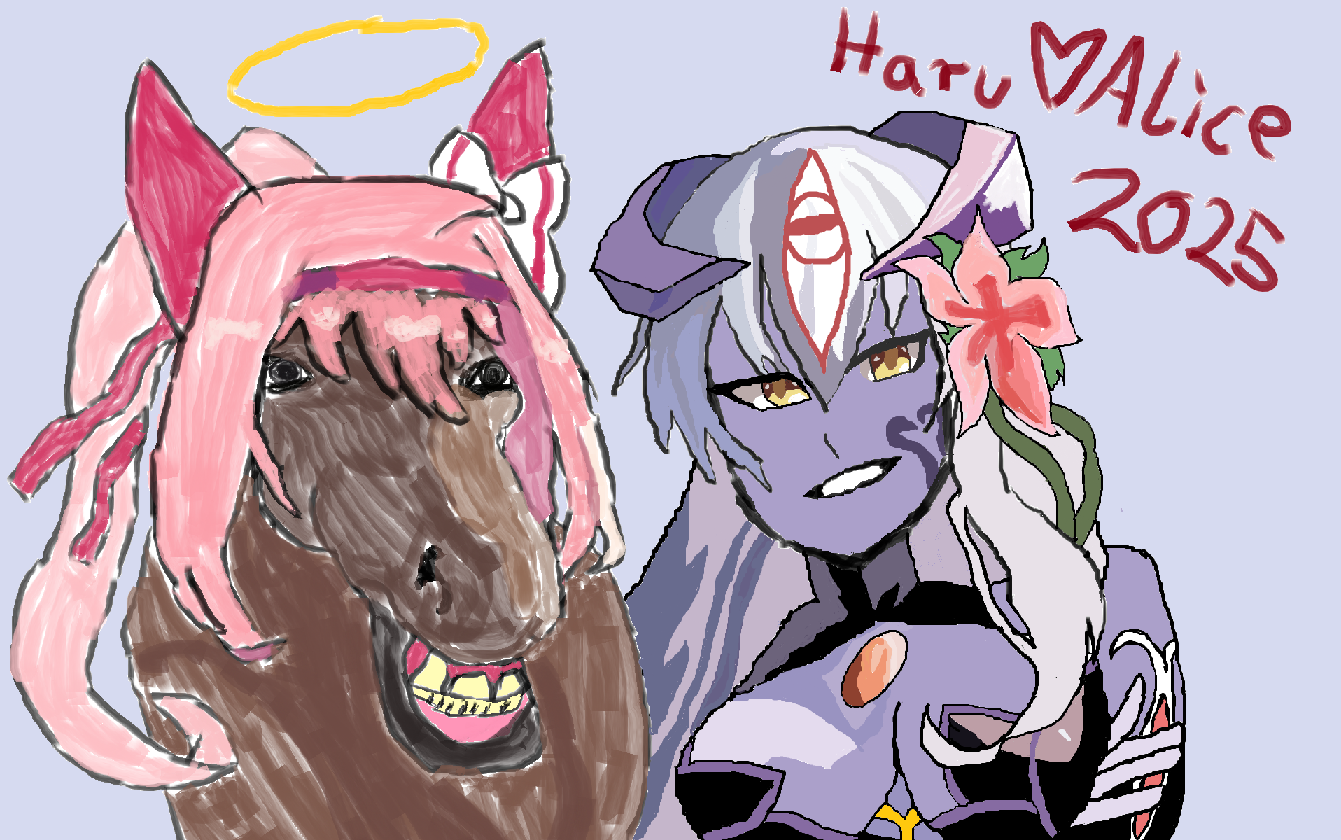 Hi everyone. To be honest, I have only rough idea what Uma Musume is about since I almost don't play games anymore, but I still lurk /v/ and /vg/ to some extend. Since /v/ is hosting their yearly competition, I thought I will draw an illustration of Haru Urara and Alice, since they were paired in round 1 (Haru lost). I thought I will share it with you as well. What do you think?