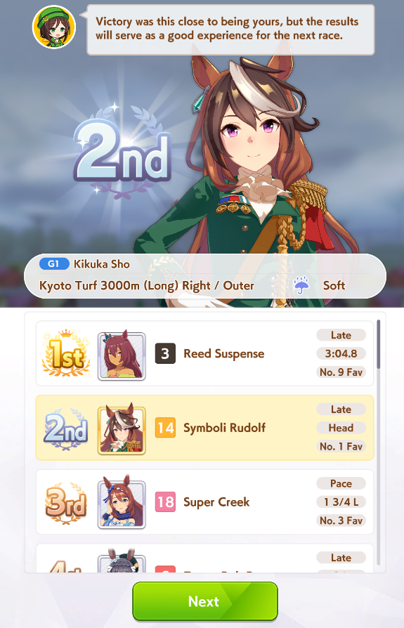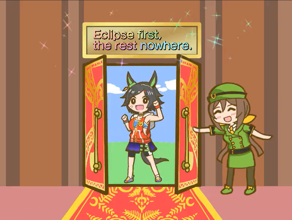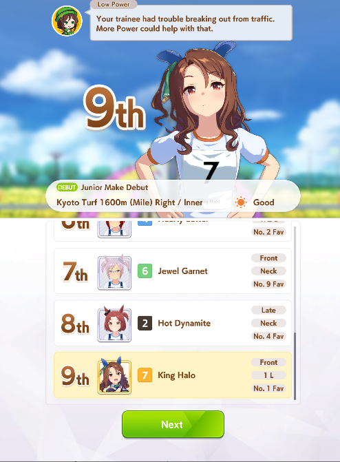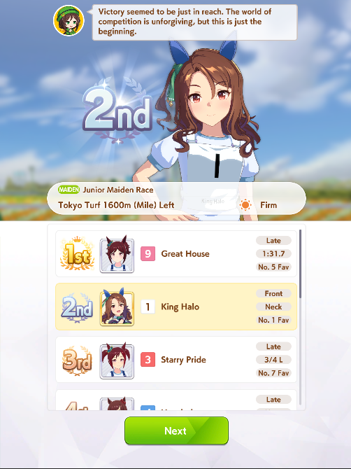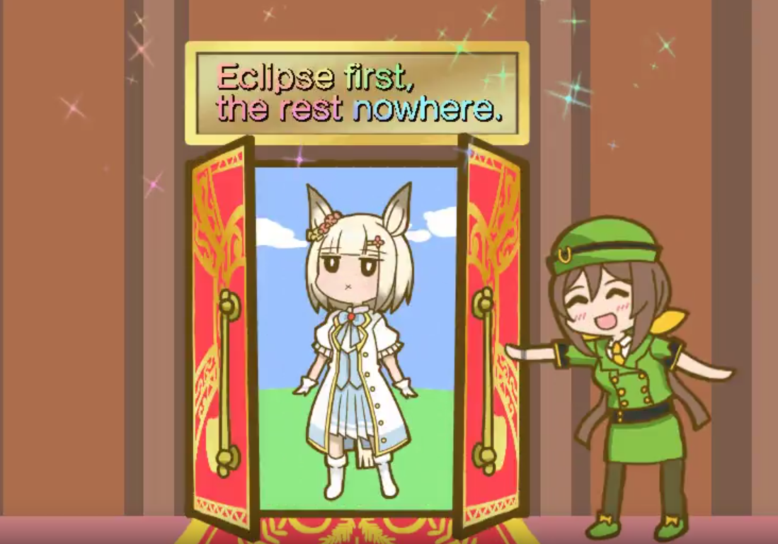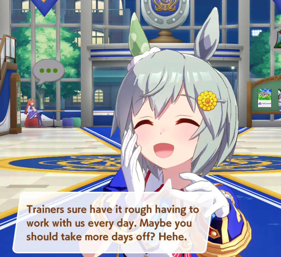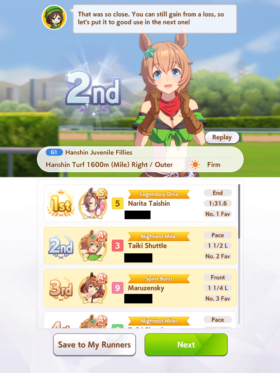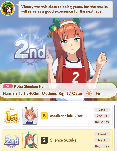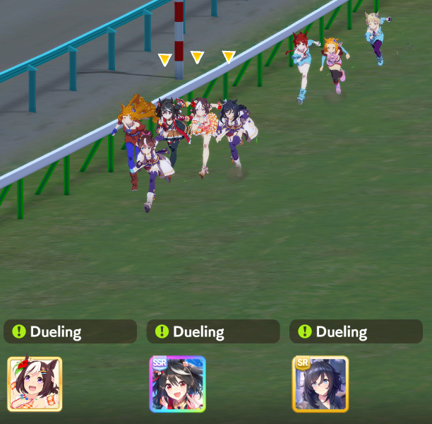 >>546201849traits your average Umamusume will promptly sniff out and exploit. Torenas covering their emotional vulnerability with a front of authority beware!>>546201990Yes, and it only gets worse from here on in. >>546202372Changes to navigation means late surgers have a shot now, which also applies to NPC umas, which means you can no longer automatically rule out half of the runners in your career races.