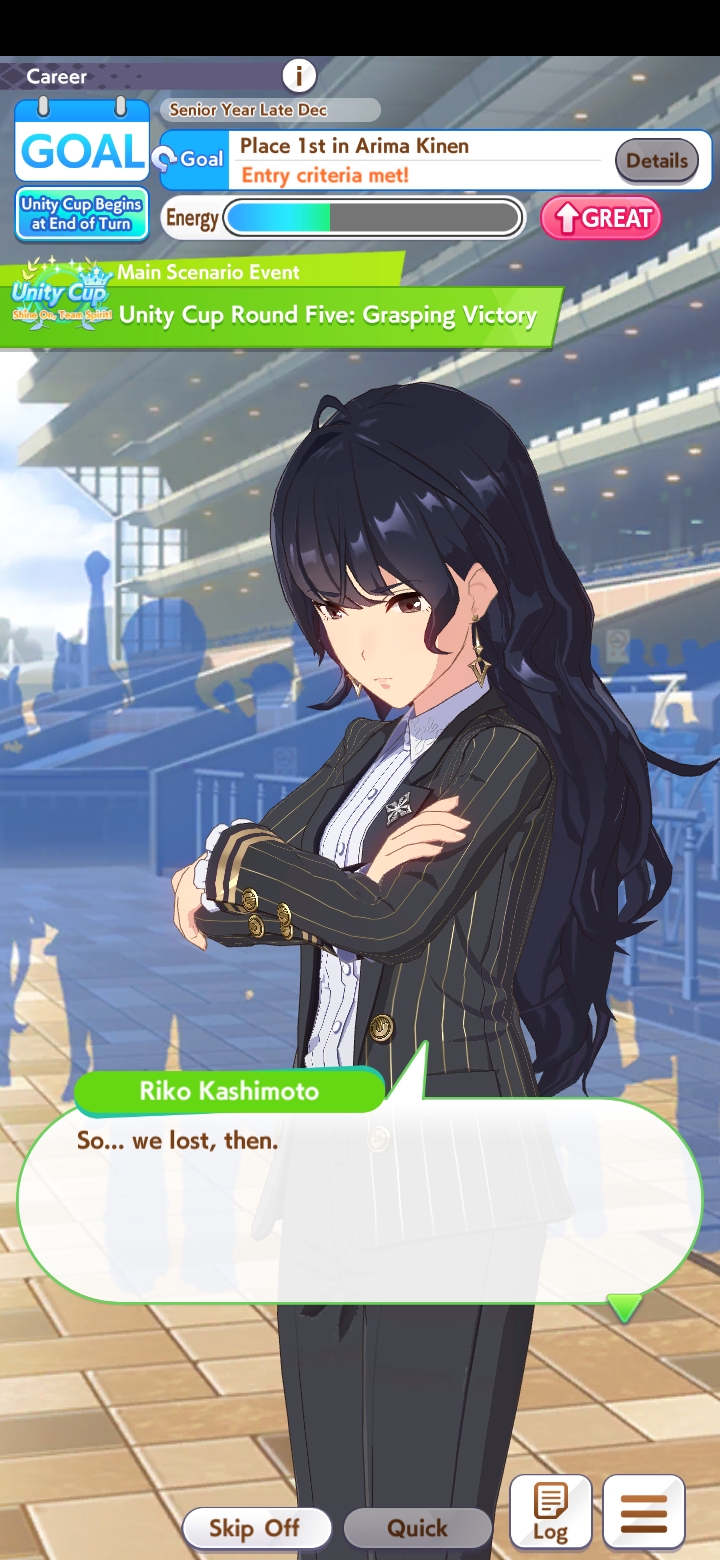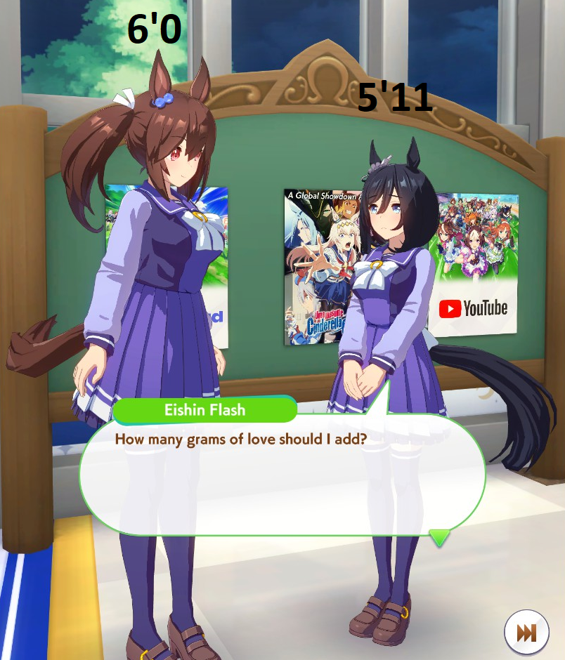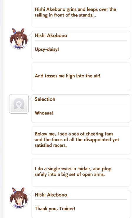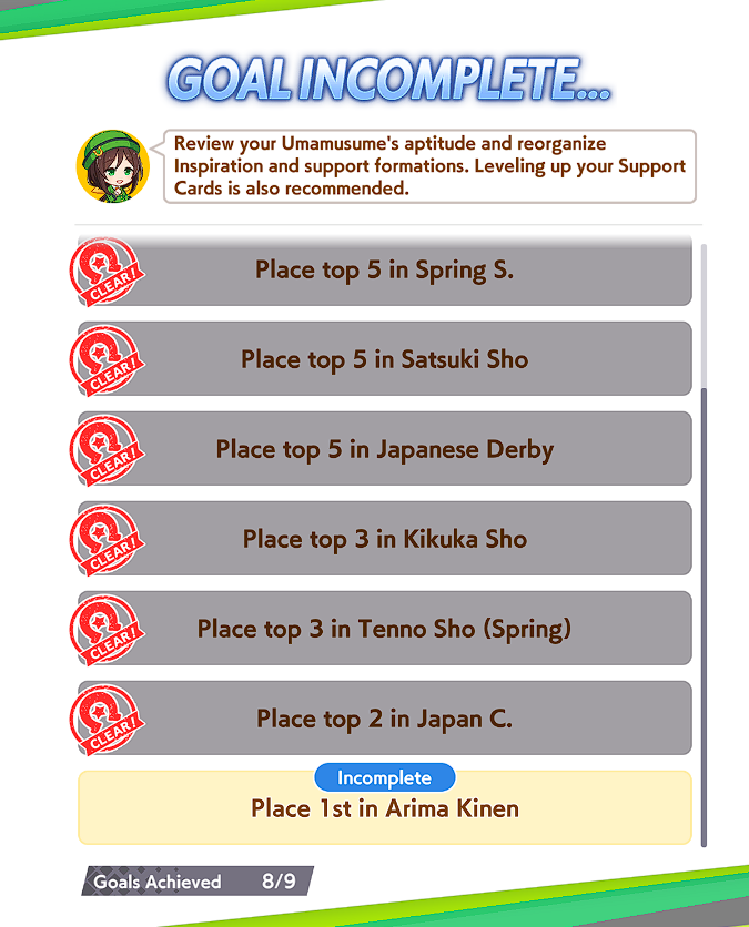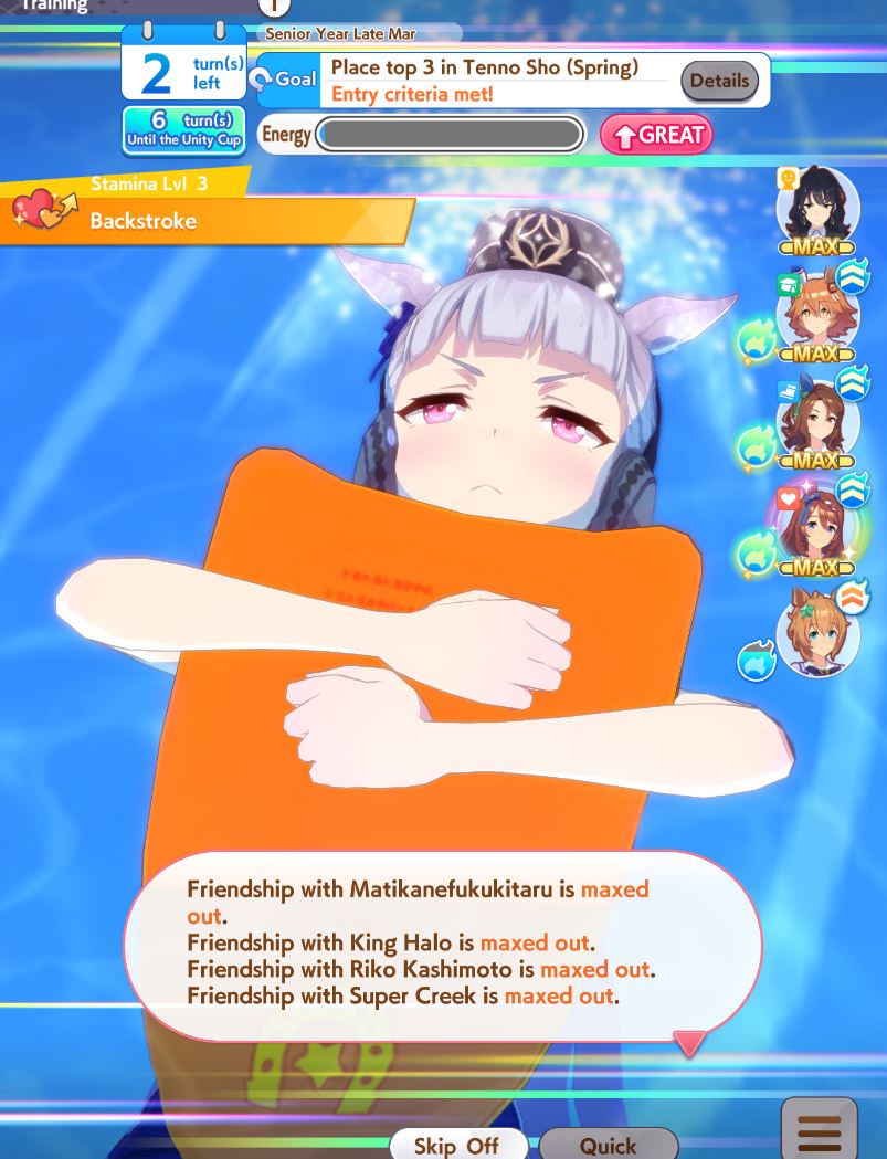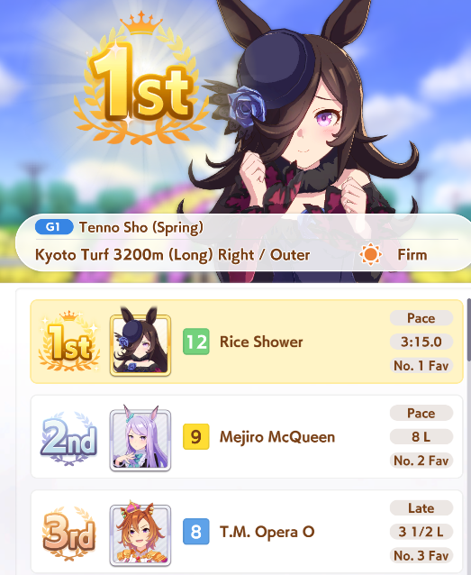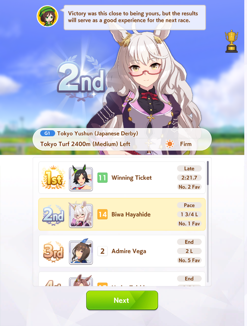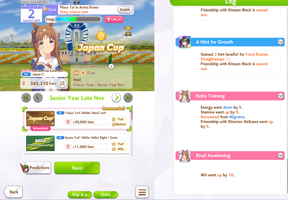 >>546201849traits your average Umamusume will promptly sniff out and exploit. Torenas covering their emotional vulnerability with a front of authority beware!>>546201990Yes, and it only gets worse from here on in. >>546202372Changes to navigation means late surgers have a shot now, which also applies to NPC umas, which means you can no longer automatically rule out half of the runners in your career races.