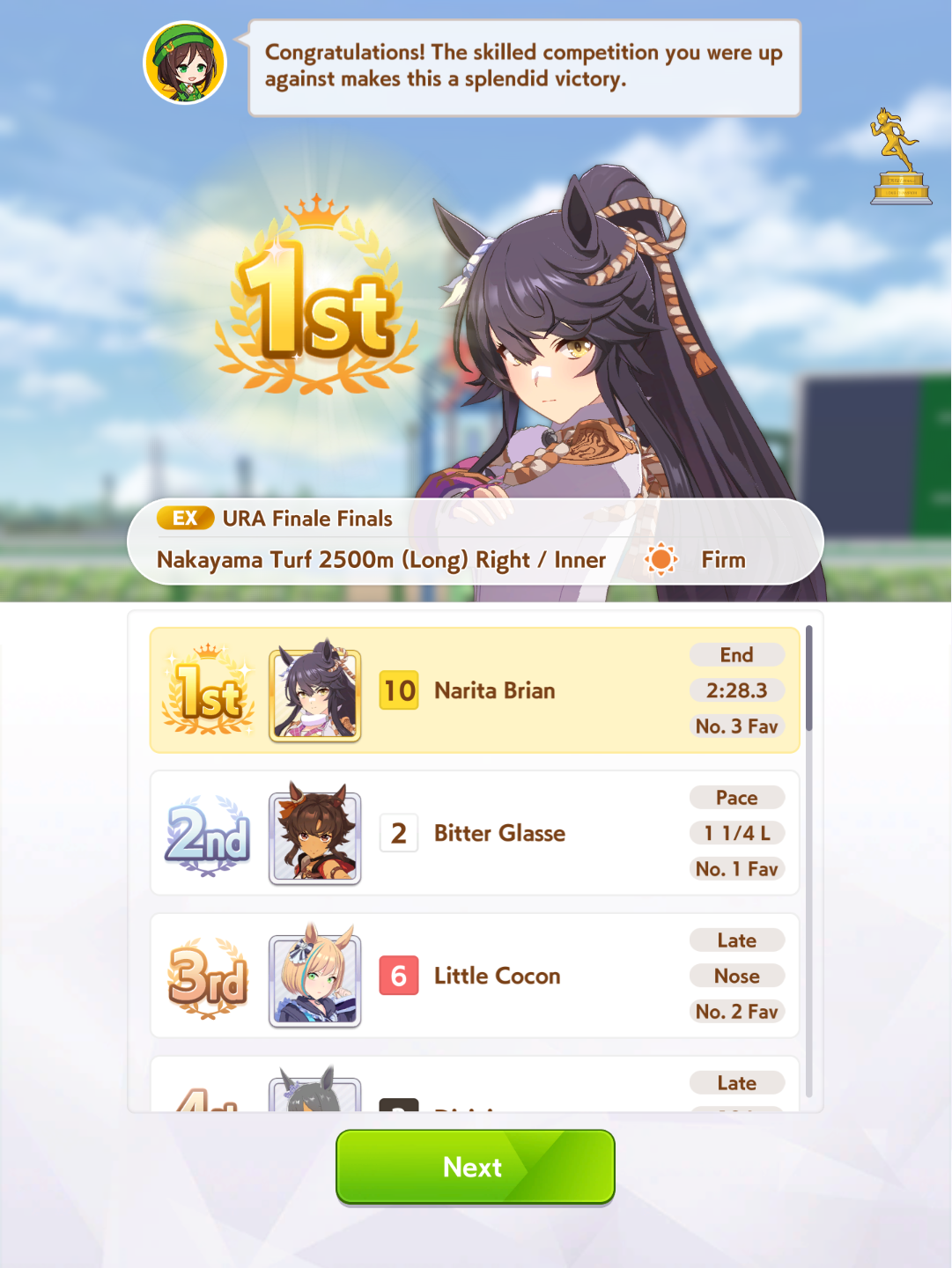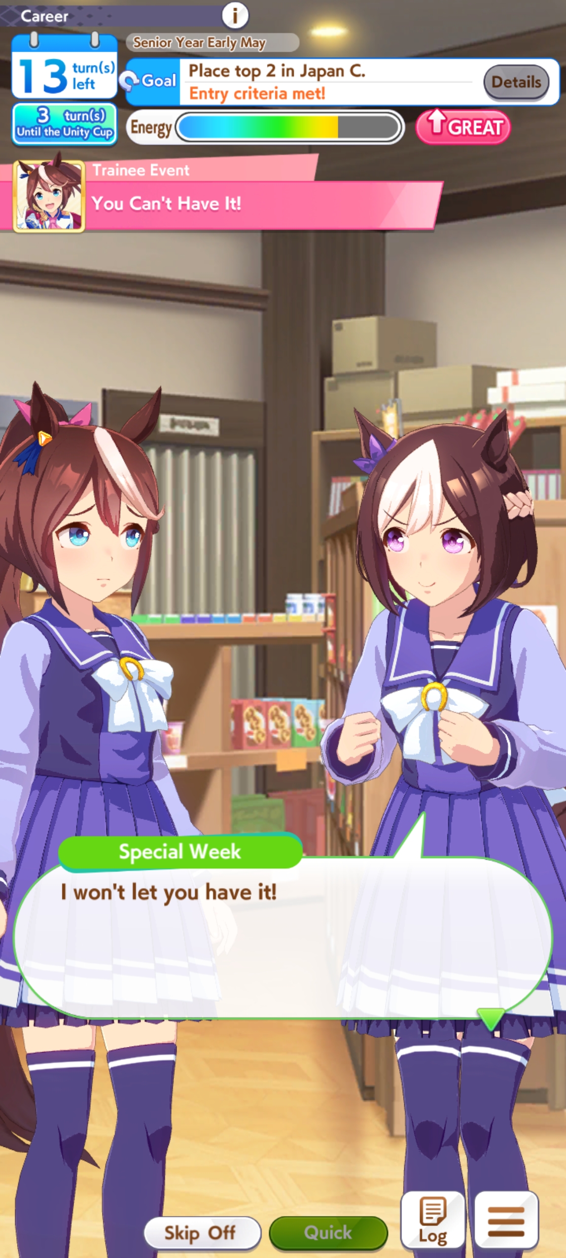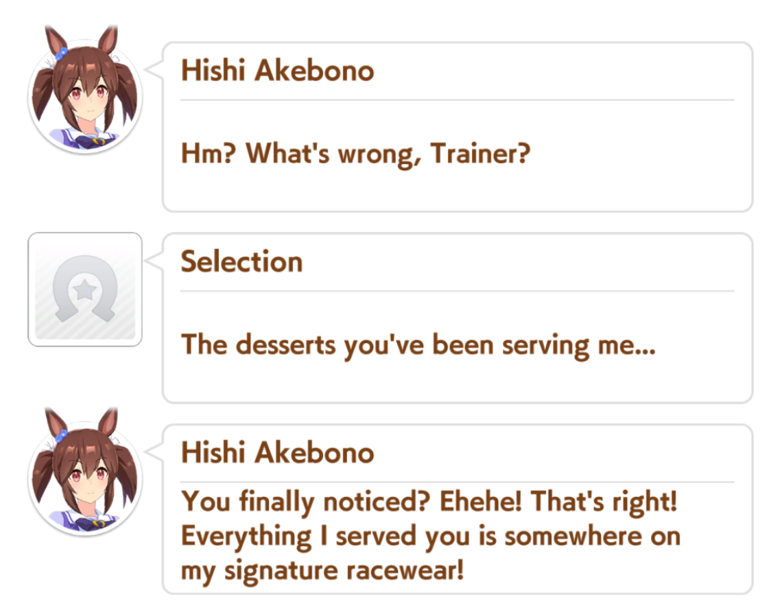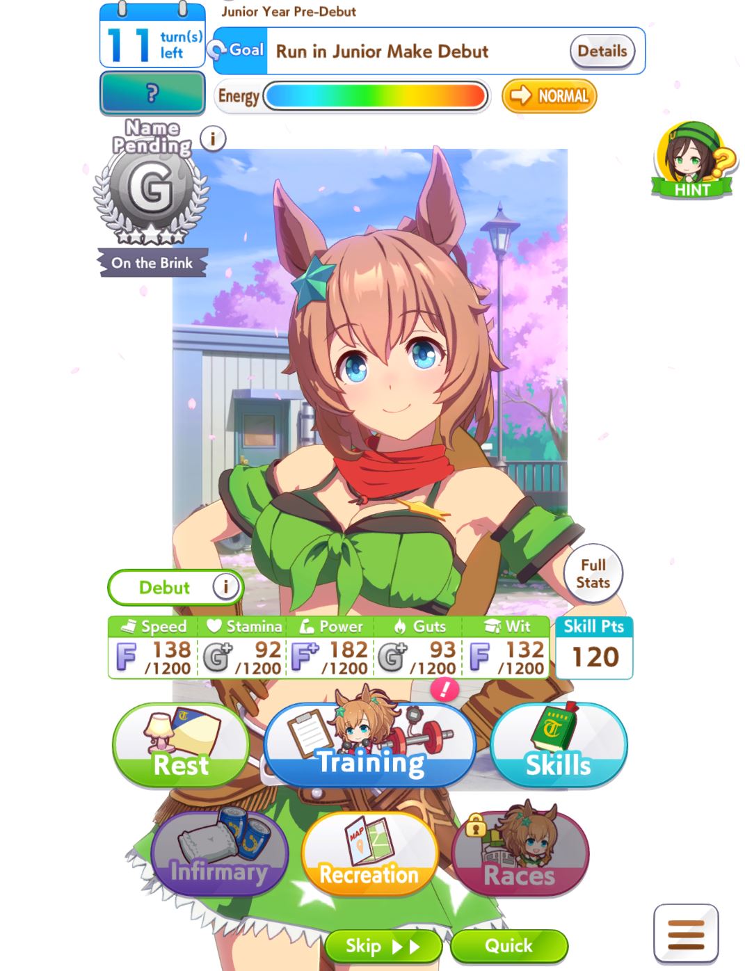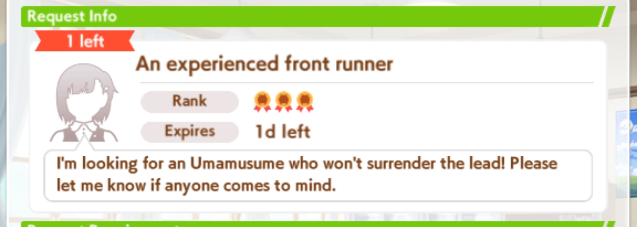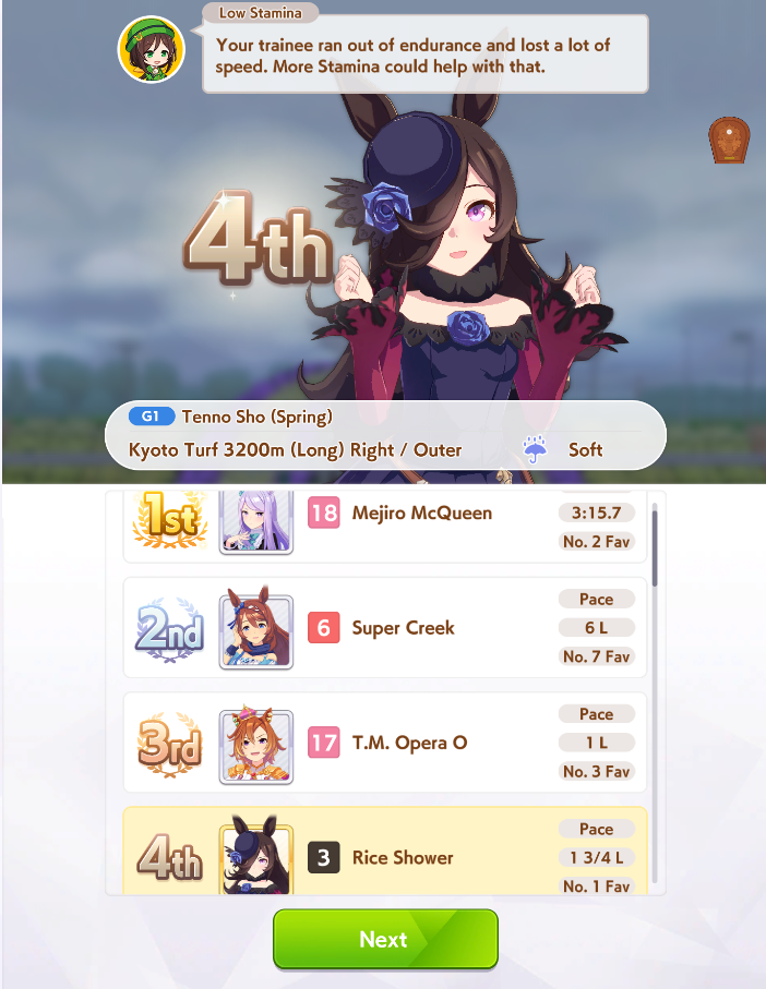 >>546201849traits your average Umamusume will promptly sniff out and exploit. Torenas covering their emotional vulnerability with a front of authority beware!>>546201990Yes, and it only gets worse from here on in. >>546202372Changes to navigation means late surgers have a shot now, which also applies to NPC umas, which means you can no longer automatically rule out half of the runners in your career races.