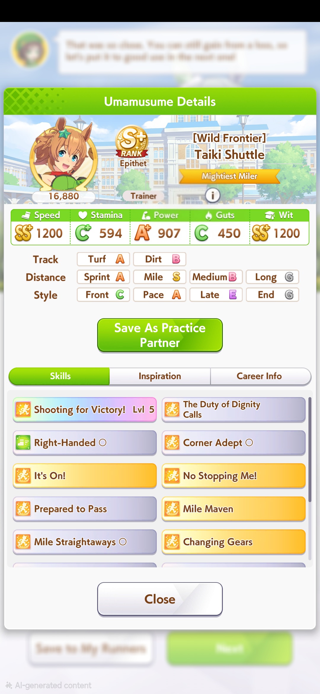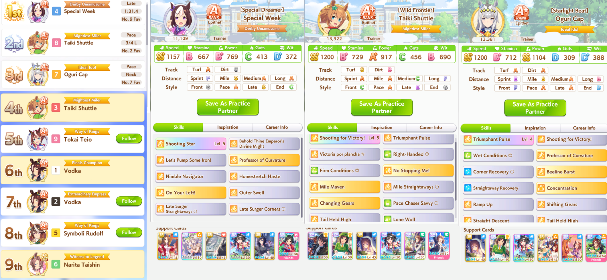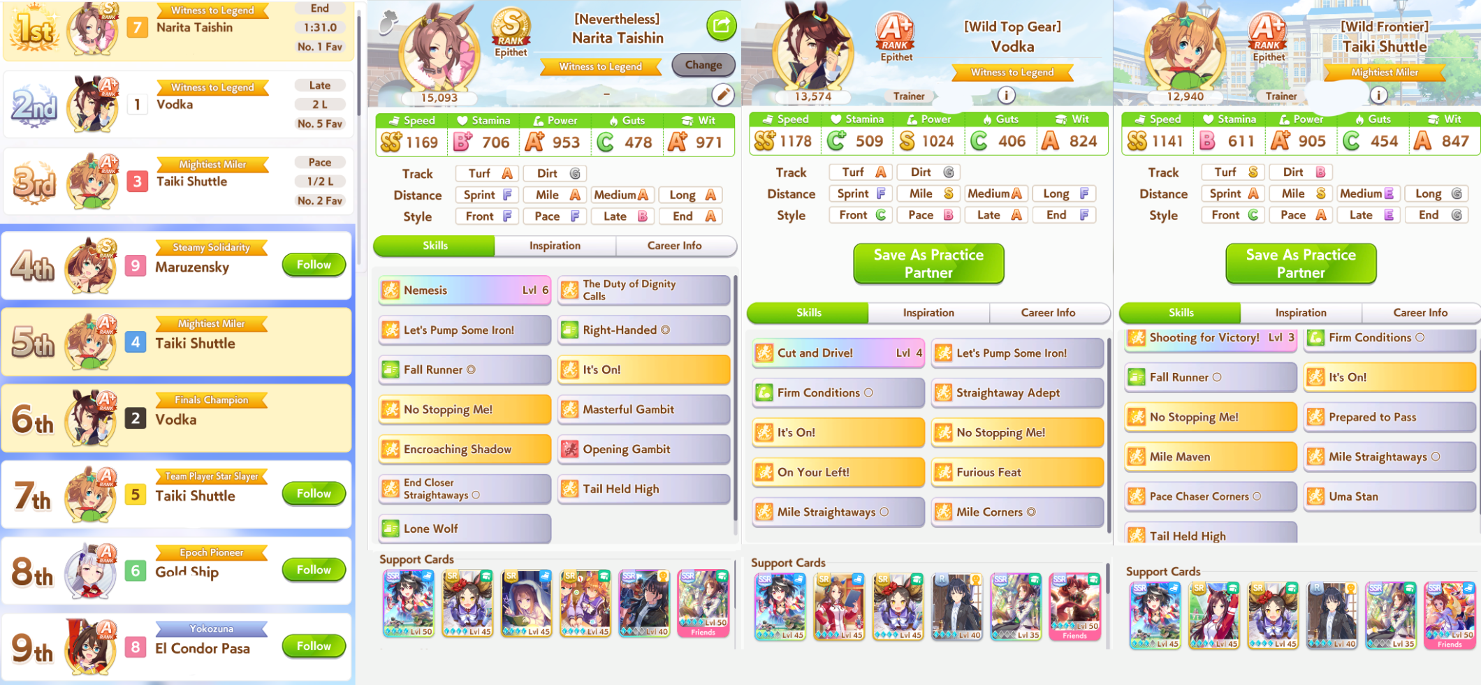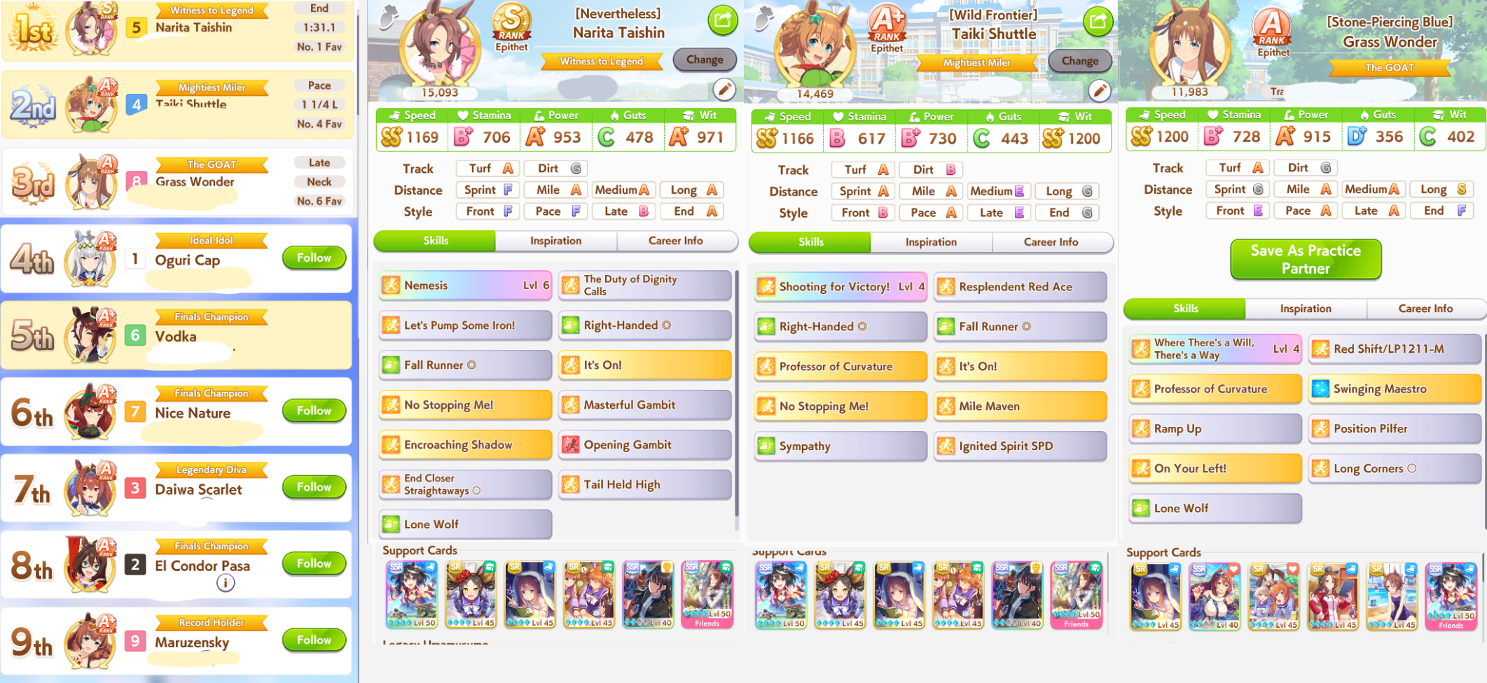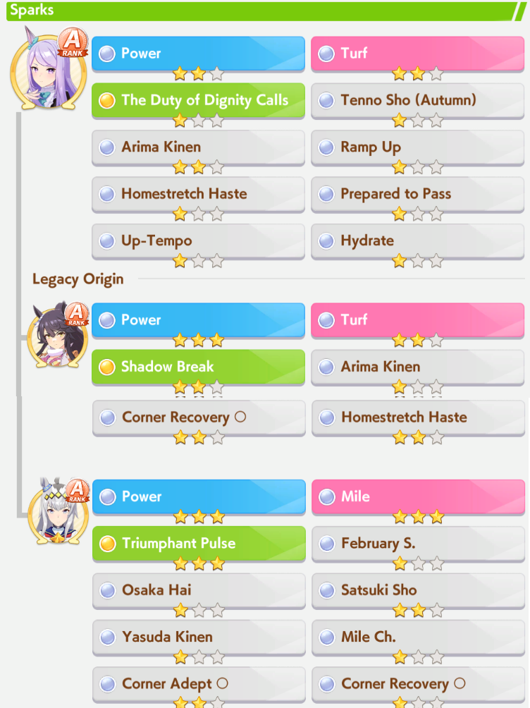 >>546201828are you even thinking about what you're saying?>take a deck that's consistent so you can improve your chances at a sparkyour ace deck is built to MIN-MAX every slot so that you end up with a unit that's beyond what a "safe" deck is capable of. there's a reason you don't take 4 speed cards when training a 20% growth-rate speed uma, right? it's because you have to estimate just how much production you need to reach your key benchmarks and be efficient with each card-slot. also, you know what produces trash aces that you invariably pivot into a parent/farm run? "safe" decks; you're always feeling like you're missing something. you're placing yourself into a self-fulfilling prophecy by bringing bad ace decks, making bad aces, and taking the consolation prize of "well, at least i hit 1100+ on two stats." further, hitting 600+ on every stat is trivial. it's why you can churn out 600/600/600 parents with the least production efficient, hint-heavy decks everyone is using now.>a highroll on speed/power (stamina) deck is still a highrollyou capped speed and hit near or did cap power. congratulations, you did what a good ace deck is capable of doing on a highroll but required two extra cards to do it for the sake of "consistency." your ace is now down two cards worth of skills and/or supplementary stats. your ability to "consistently" churn out mediocre units means nothing, you can only field one. it means you lose to anyone that took the time to grind out a good one.