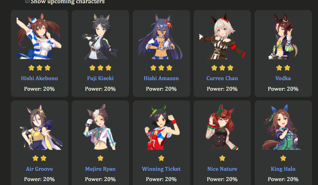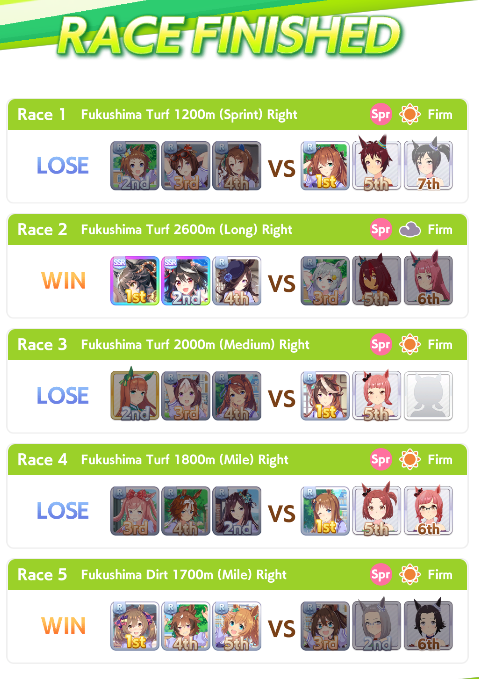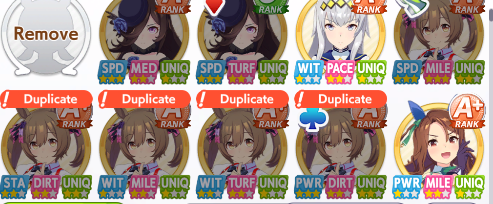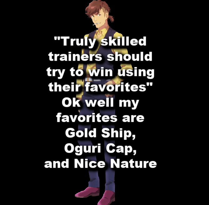 >>546203473>your ace deck is built to MIN-MAX every slot Yeah, I'm trying to min-max the most valuable stats, so I'm bringing cards that raise the likelihood of achieving that goal to the maximum. If I fail to achieve those goals, the run is a parent run. If I don't get good sparks, the run is glue.>you capped speed and hit near or did cap power. congratulations, you did what a good ace deck is capable of doing on a highroll but required two extra cards to do it for the sake of "consistency."Yes. Precisely so. I now have a good horse that I can field. And with a sufficiently good roll in the races, I can win.>it means you lose to anyone that took the time to grind out a good one.No, it doesn't. It means that I lose to anyone that rolls well. Regardless of the stat difference, whether positive or negative.Why would I care if I lose to a whale? I don't want to spend money on the game.Why would I care if I lose to someone with better stats? Ultimately, the races come down to luck. You can twist that luck slightly to your favour, but your end result is still dictated by it.I don't always have a video I want to watch on the second monitor while I absent-mindedly click buttons in uma musume. I'm not always commuting to work. Sometimes, I want to play better games. Why would I waste my time hoping for a witcuck highroll when I can just take decent cards, and consistently get good umas that I can use as parents and replace racers in my TT roster if the results are not good enough for CM?