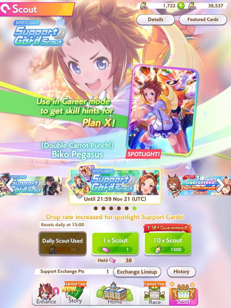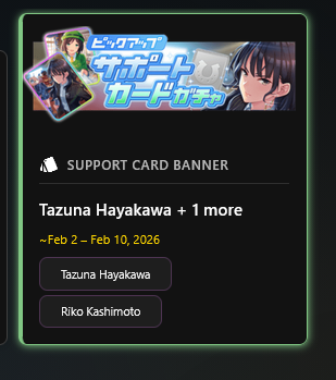 Previous: >>546167821>Global Game NewsCurrent Scenario: Aoharu Hai aka "Unity Cup"Current Specials Missions: Half Anniversary Part 2+3Current Rate Up: Hishi Akebono (3*) Matikanefukukitaru (3* Alt), Biko Pegasus (SSR), Sakura Bakushin O (SSR), Riko Kashimoto (SSR), Rice Shower (SSR)11/11 - Balance Adjustments AKA Umamusume 2https://umamusume.com/news/100040/https://pages.snep.pw/uma/anni-skill-changes/11/13 - Legend Races11/16 - VIRGO CUP - Hanshin 1600m11/24 - Story event>JP Game NewsCurrent Rate Up: Wonder Acute alt (3*), SSR Mihono Bourbon (Power)New Scenario "Yukoma Hot Spring" releasedTimeline: https://uma.moe/timeline>IP NewsUmamusume Cinderella Gray 2nd season started weekly airings on 10/5>Thread Clubshttps://rentry.co/umaglobalclublistYou must be E3 (20k points) to join a circle. Apply with /uma/ or /vg/ in your profile or post ID in the thread.>All Guides & Resourceshttps://rentry.org/uma26Game databasehttps://gametora.com/umamusume (Click the gear to switch between JP / global server info)A basic guide for newfagshttps://rentry.org/umaglobalFind networks if your region is blocked from the game or clienthttps://www.umavpn.top/93Seiyuu & Concertshttps://rentry.org/umst/uma/ POG (Paper Owner)