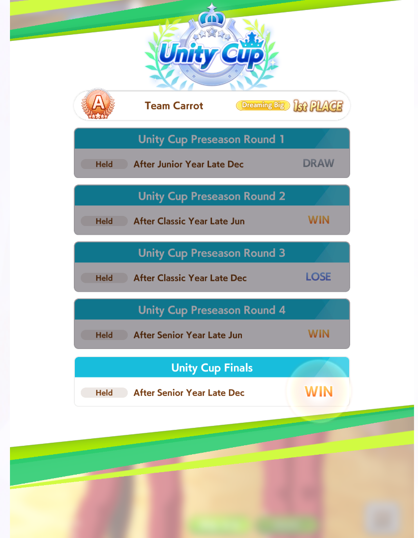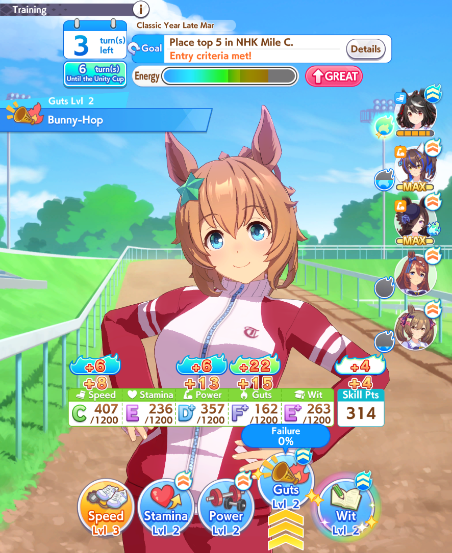 >>546217991from my experience thus far, unity is all about ensuring you can win the cup races until senior year and praying you just luck-shit into a multi-rainbow trainings in the last spurt of the career. i've had a few careers where my stats look like a parent run until they don't.