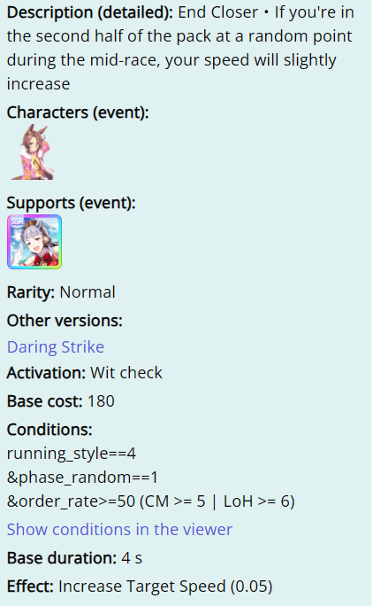 For anyone playing Rice career: just buy Determined Descent, especially after 2nd inspiration. It makes your Med/Long races so much easier. Fishing for a lucky hint or if you have the privilege of parents with the white skill is not worth it.