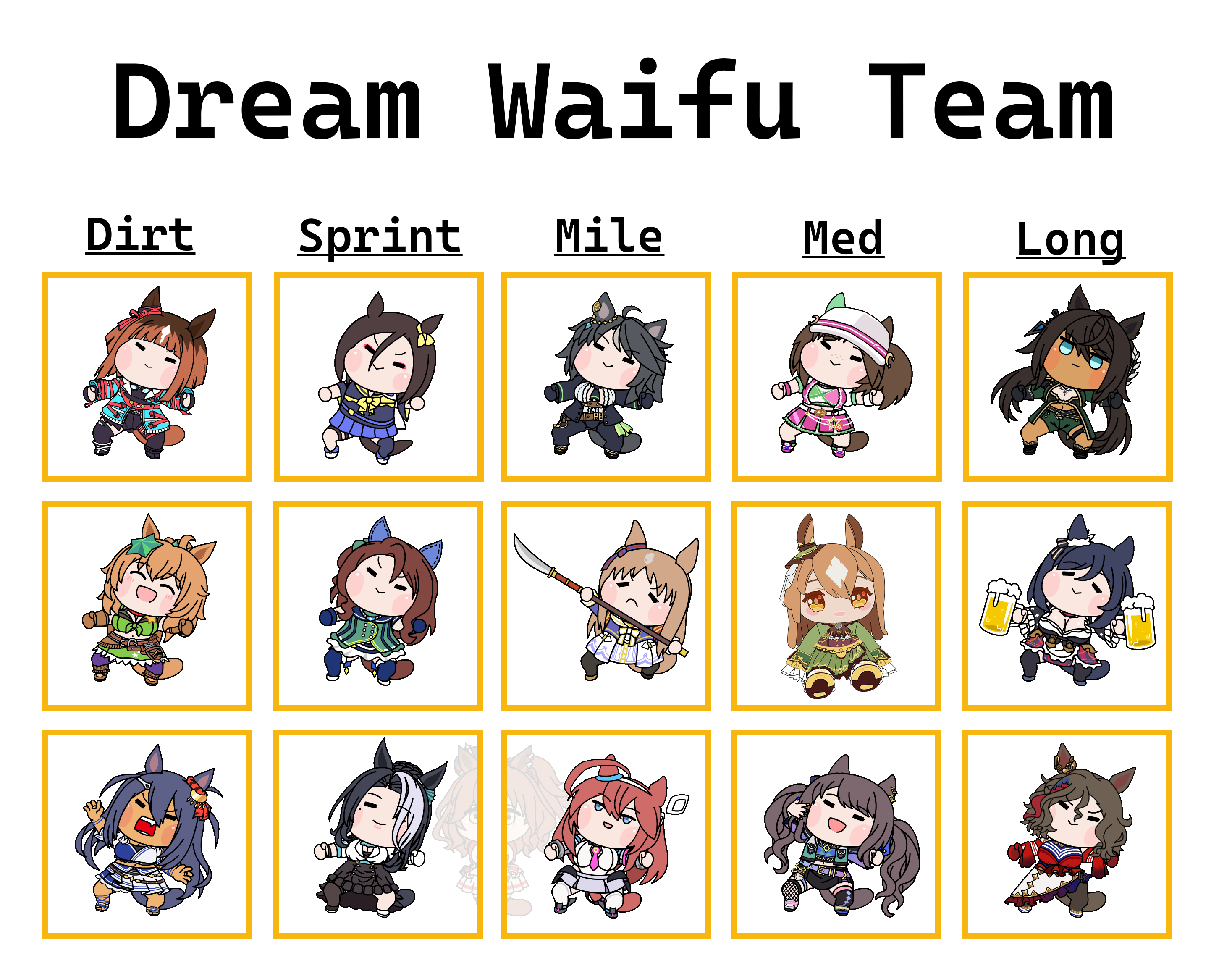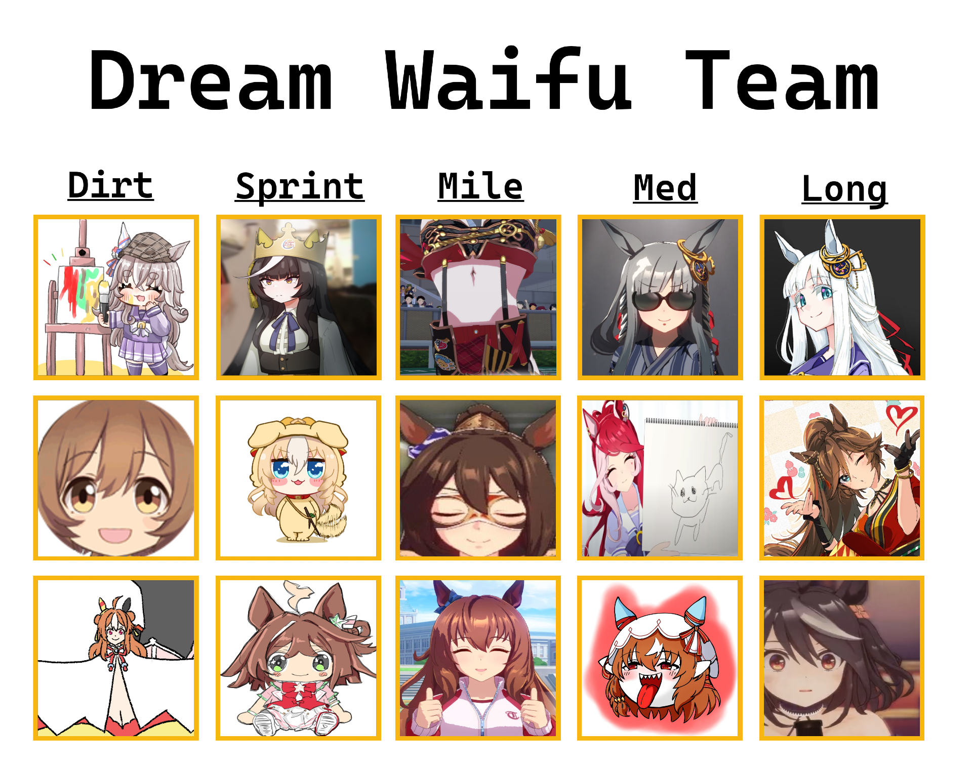 >>546218258A collage of some late surger builds, most of them from non-/uma/ rooms