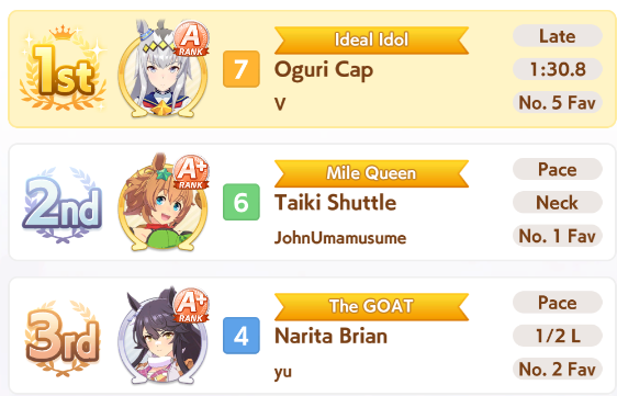 >used Taiki last CM>now every sweaty asshole and monkey-see-monkey-do idiot is going to use herThe only worst feeling than your uma not being decent for CM is your uma being a top choice and all these meta slaves slobbing all over her. Soulless cunts.