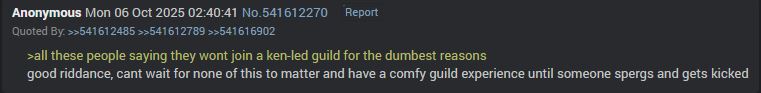 >>546208003I spoke to guild leadership earlier today about how we'll proceed further with managementI understand the way I've handled things might've been too "hands off" for most, so we'll try to be more strict in punishing anyone who leaks guild matters in the futureThis won't be retroactive. Everyone who has been caught "leaking" will have a second lifeline. If they're caught again, and any first offenders after our rule changes, will be permanently removed from the guild. I also spoke with creep and it'll be a blacklist on both sides