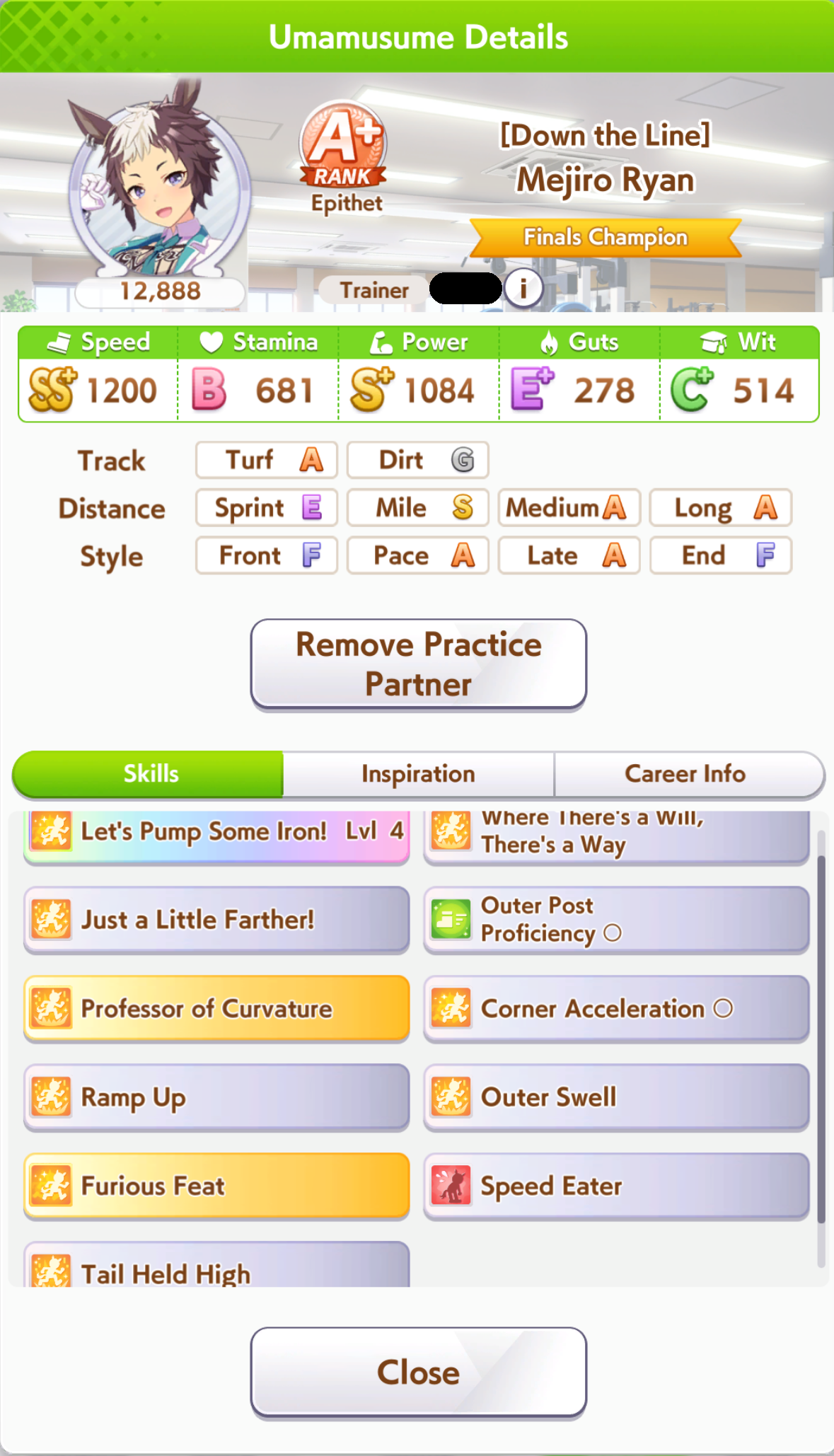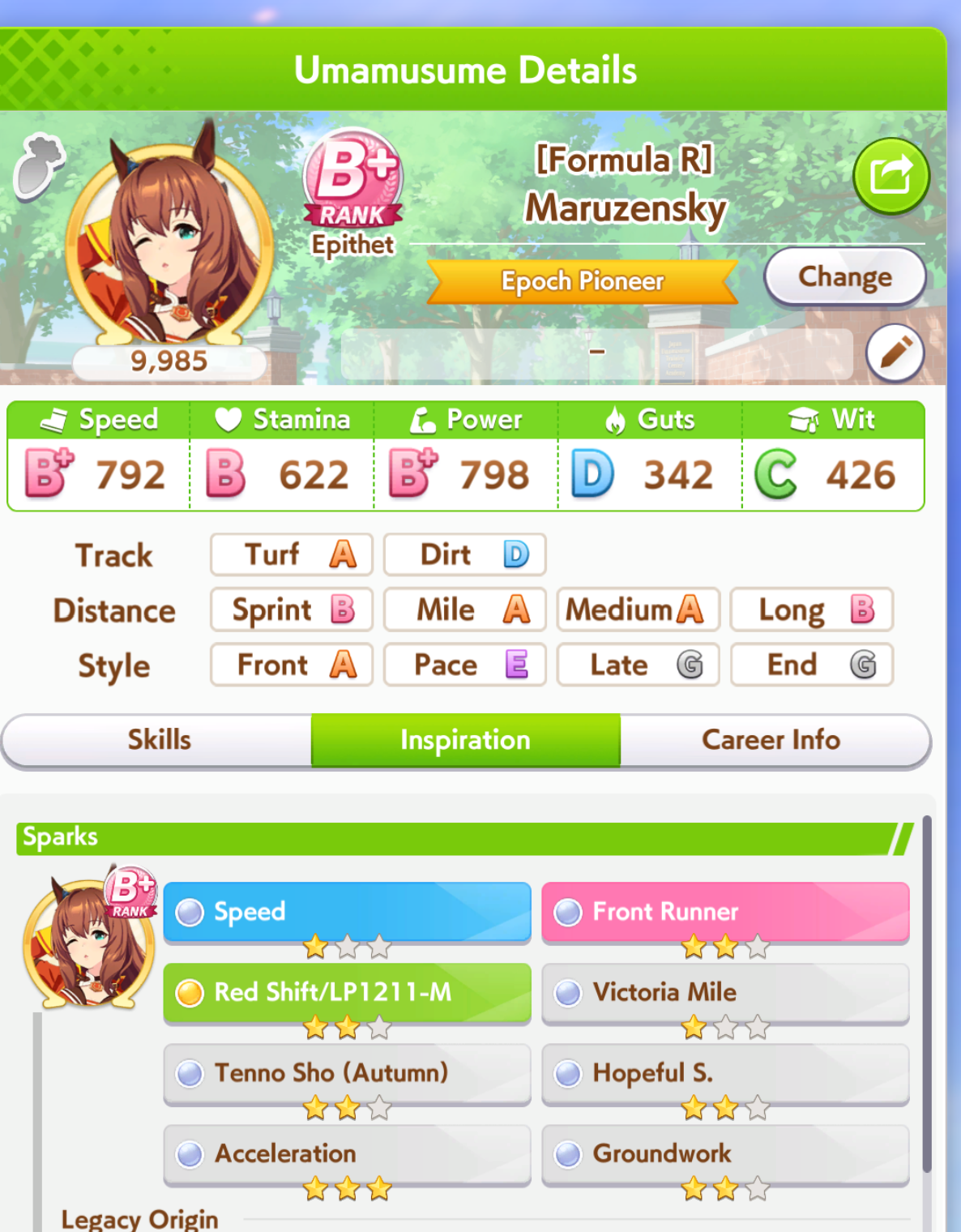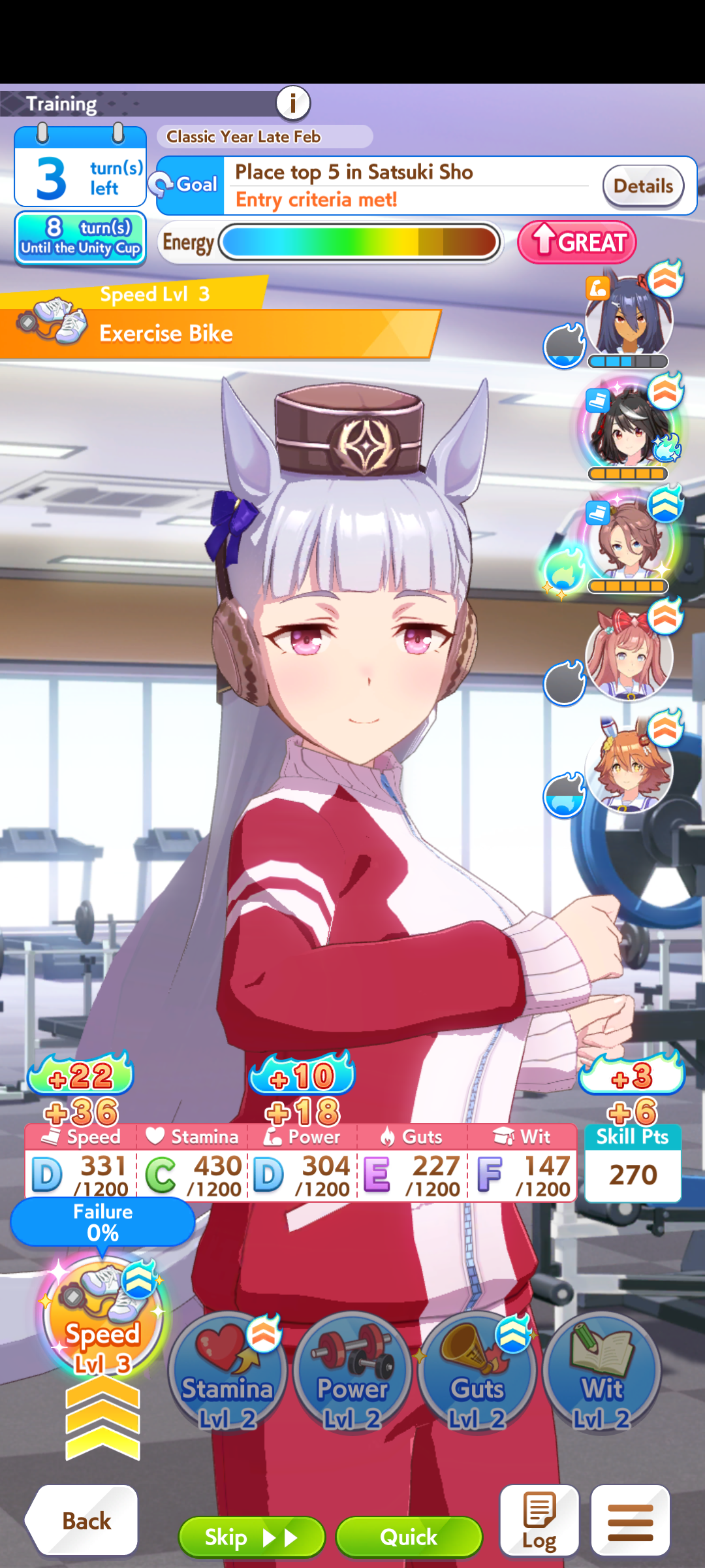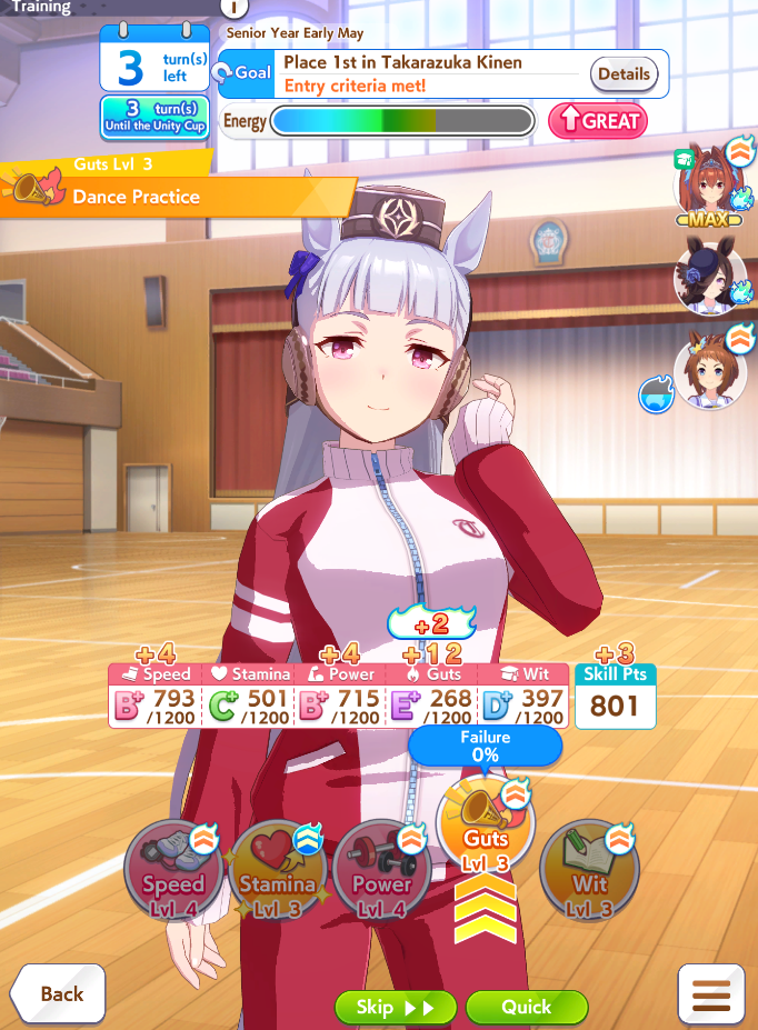 >>546236307Im running 3LB Tazuna, 0LB Riko, 3 speed + borrowed Rice at the same time to get a better odds at reaching 1200 speed. I think thats the best for my short mile med on Aoharu. Tazuna date is for massive energy gain, Riko dates is for bad training options>>546236283I end up with 800, not ideal.