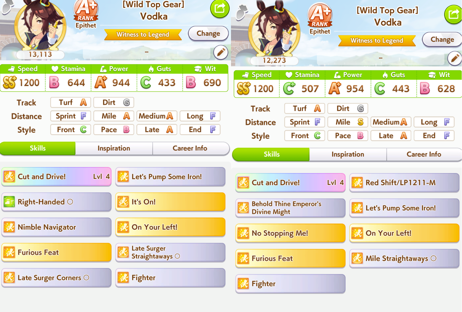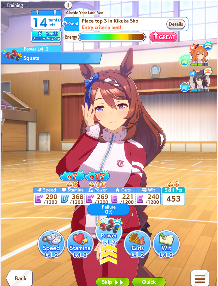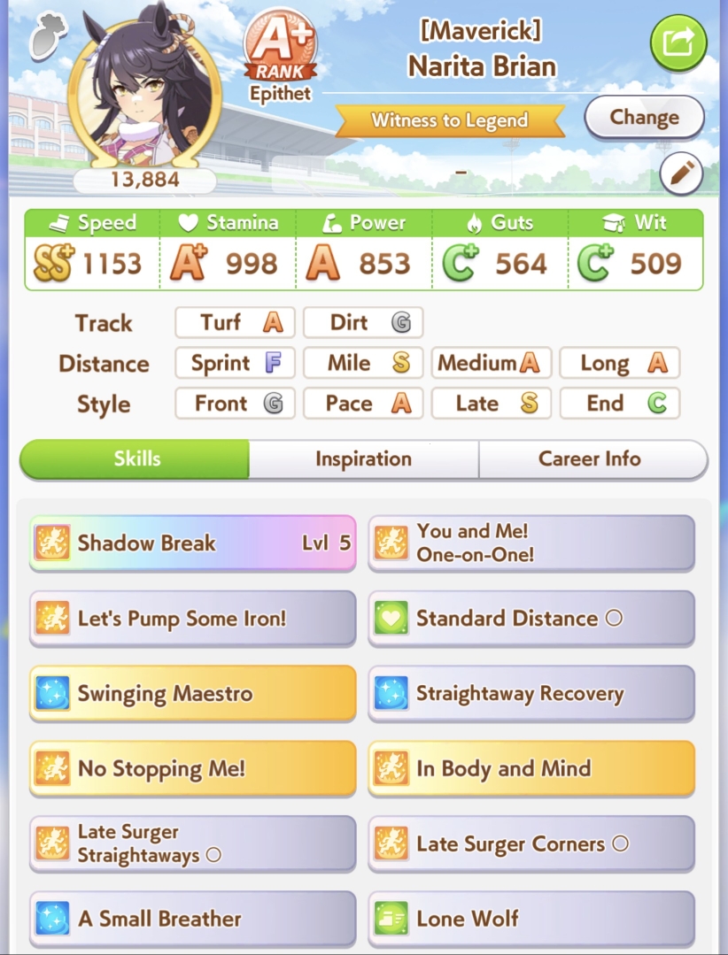 >>546236128I'll try that next, thanks. I have MLB Kitasan and Nishino LB1 as a second speed card since the latter's green skill hints are for CM5, but maybe I should add in Flash to get late surge skills as well.>>546236214I'll just watch some Unity run videos here in a bit to see what I am missing. I always get Speed Lv 5 during summer at the earliest no matter how many people I am training and spirit bombing.