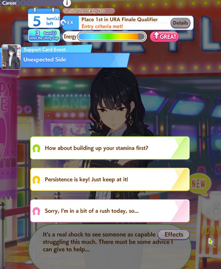 >>546235842Items in the shop are random.Rivals appearing in races is random (they can show up in G3 instead of G2 or better races).Winning races is harder and will suck your clocks dry.Race stats you get after winning is random, have fun getting guts and wit every time.Did I mention the random shop items? Yeah, you need to check and scroll the shop every 4 turns so you don't miss any random spawn.There's also an item that rerolls your support stacks and it's random, you can use it 3 times in a row and get worse stacks than before you used it.You do this for 1 hour while hoping the fast learner item spawns (it doesn't) and your run is bricked.
