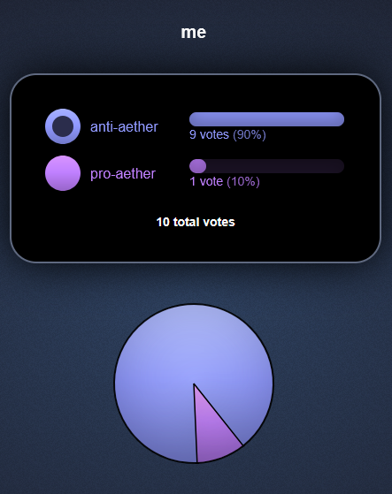 >>546239707anyone can manipulate the votes of a poll you know, it just goes to show that literally only the anti aether schizos bothered with that poll in the first place
