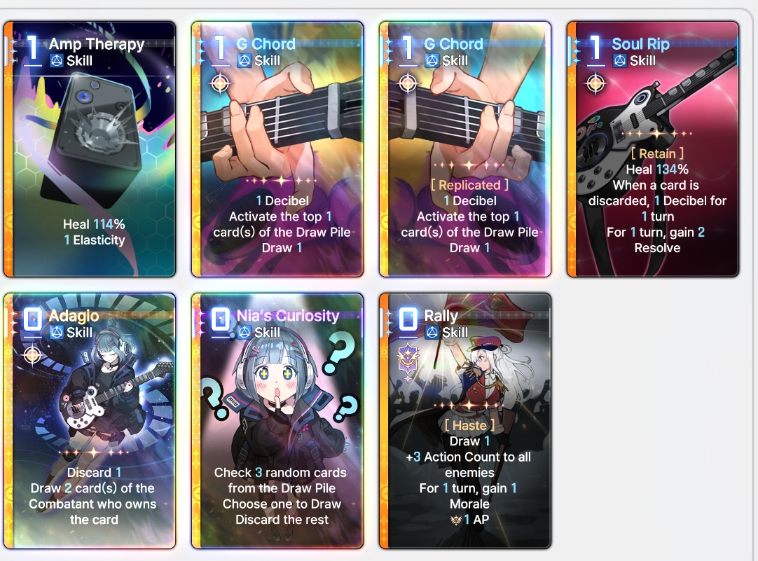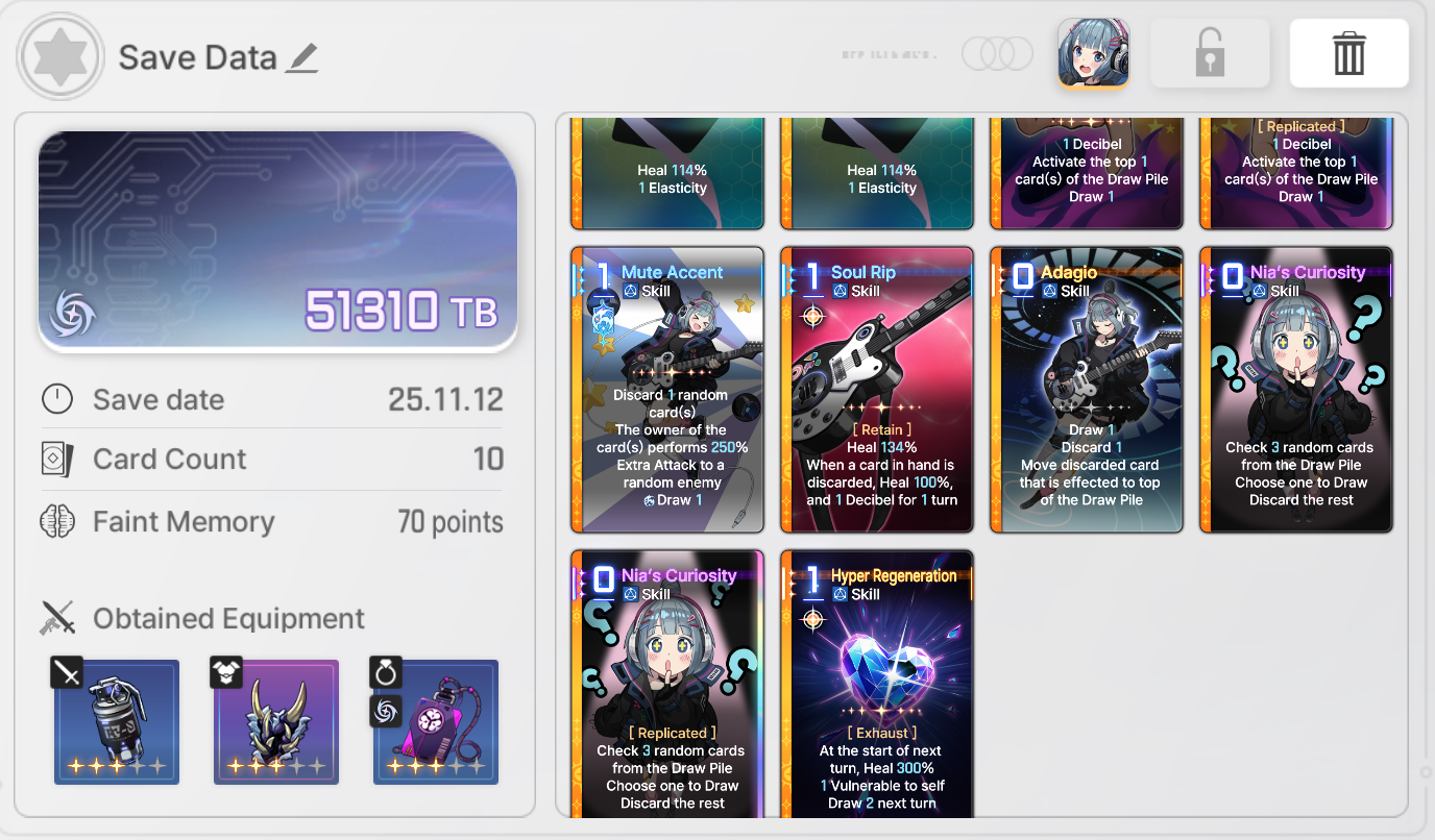 Nia's Discard 1 random attack at start of turn with bug out your run and make you unable to play any cards.Youve been warned