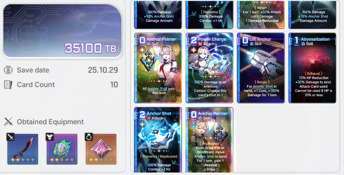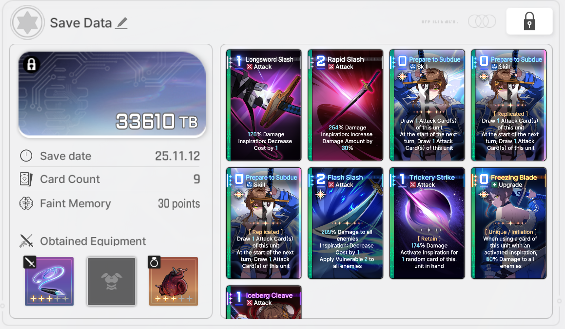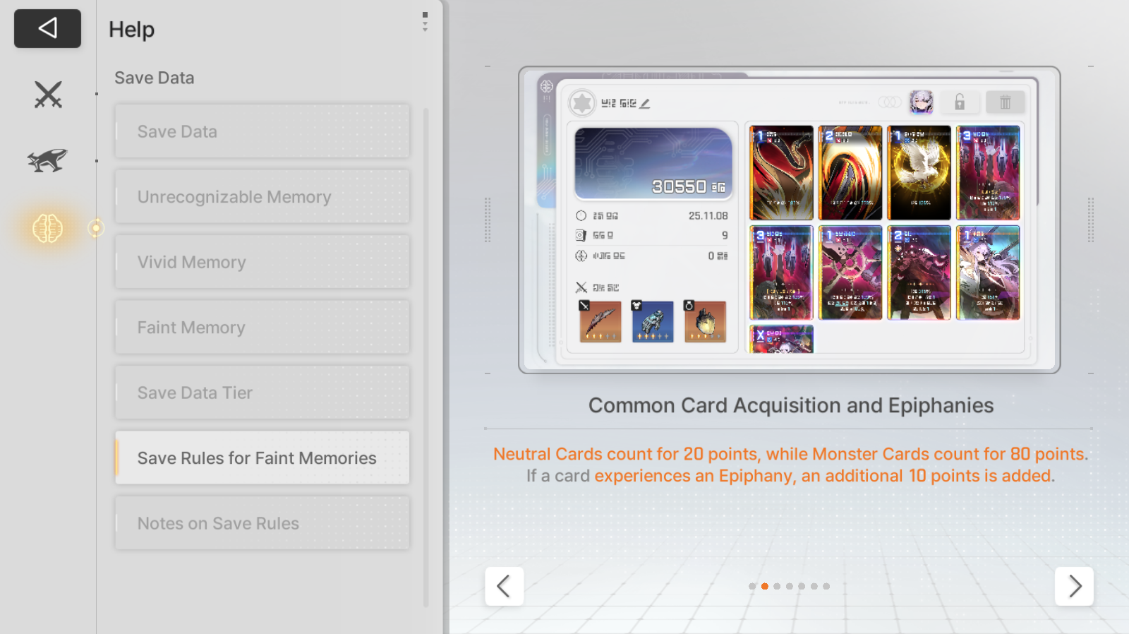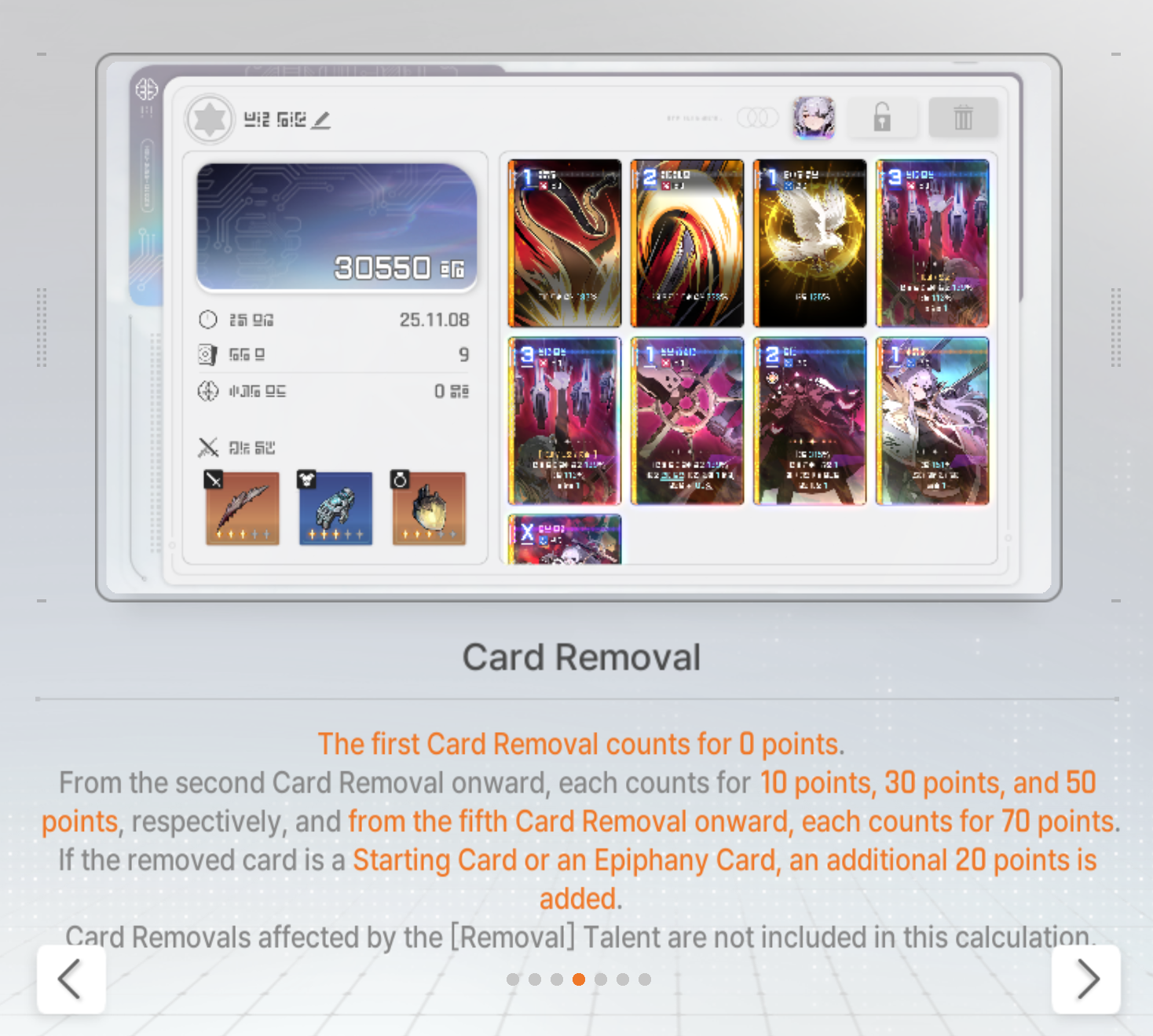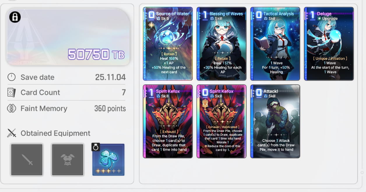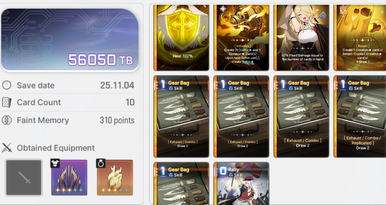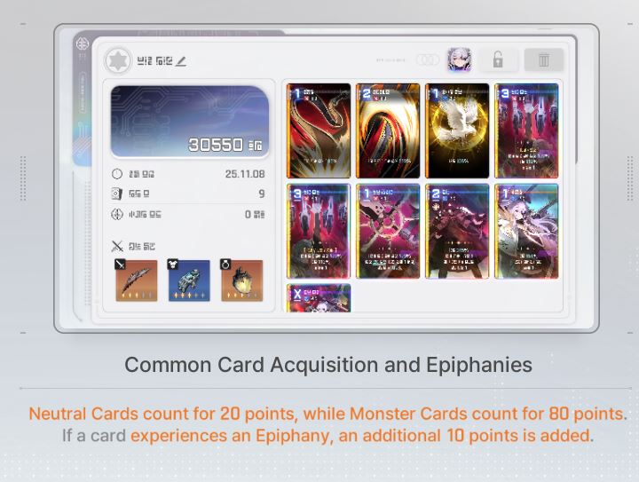 Save Card CalcsReminder that if your save is higher than the tier cap, the game will randomly delete or replace one of your cards with a basic card until the number drops to the tier capYou don't gain any points for gaining unique cards tied to your character.Neutral Cards = 20ptsMonster Cards = 80ptsRegular Epiphany= 0 points for Basic and Unique cards, +10pts for Neutral and MonsterDivine Epiphany = 20ptsCard Removal = 0pts for the first card, then +10/30/50/70. Also +20 if it's a basic cardDuplication = 0pts for the first time, then +10/30/50/70. Also add 10/20 for epiphany Convert = 10pts. Plus points for epiphany Forbidden card = 20pts but saved 100% of the timeYour save cap is basically 30+Your tier. That's basically it