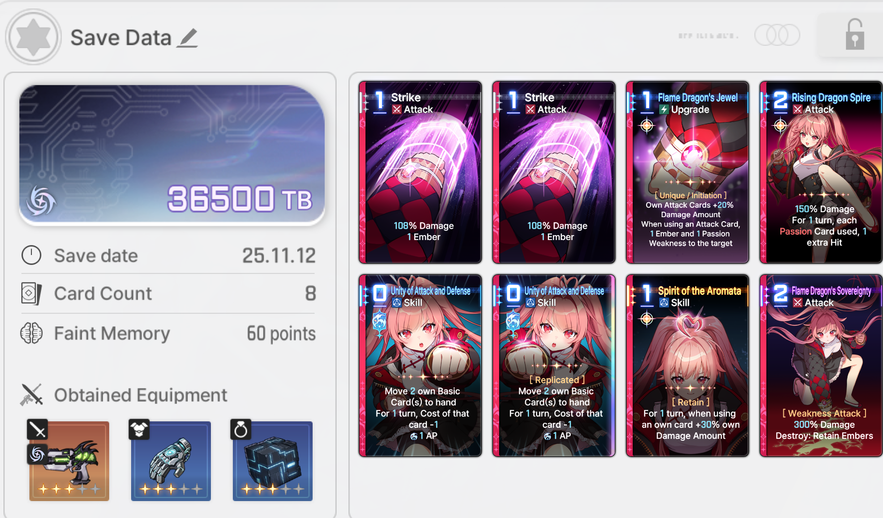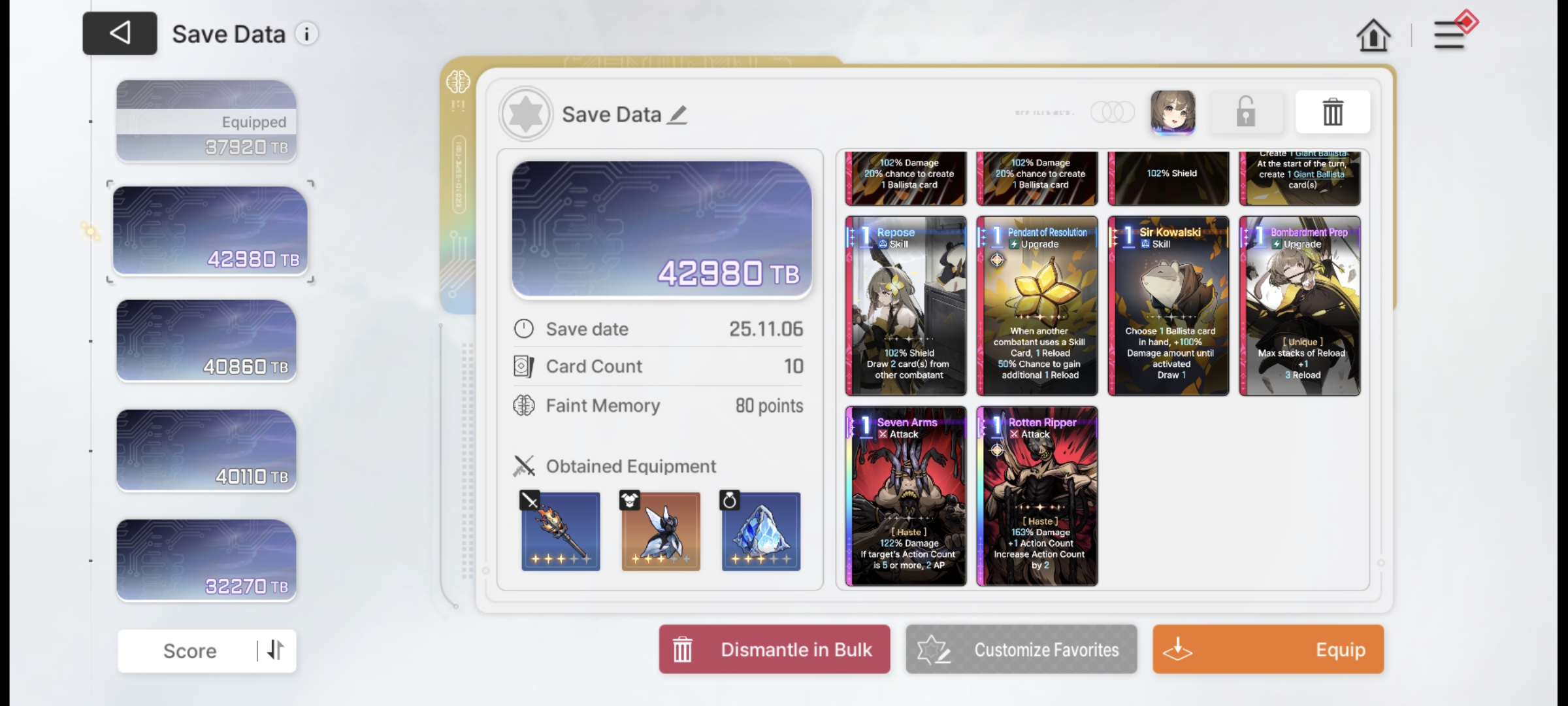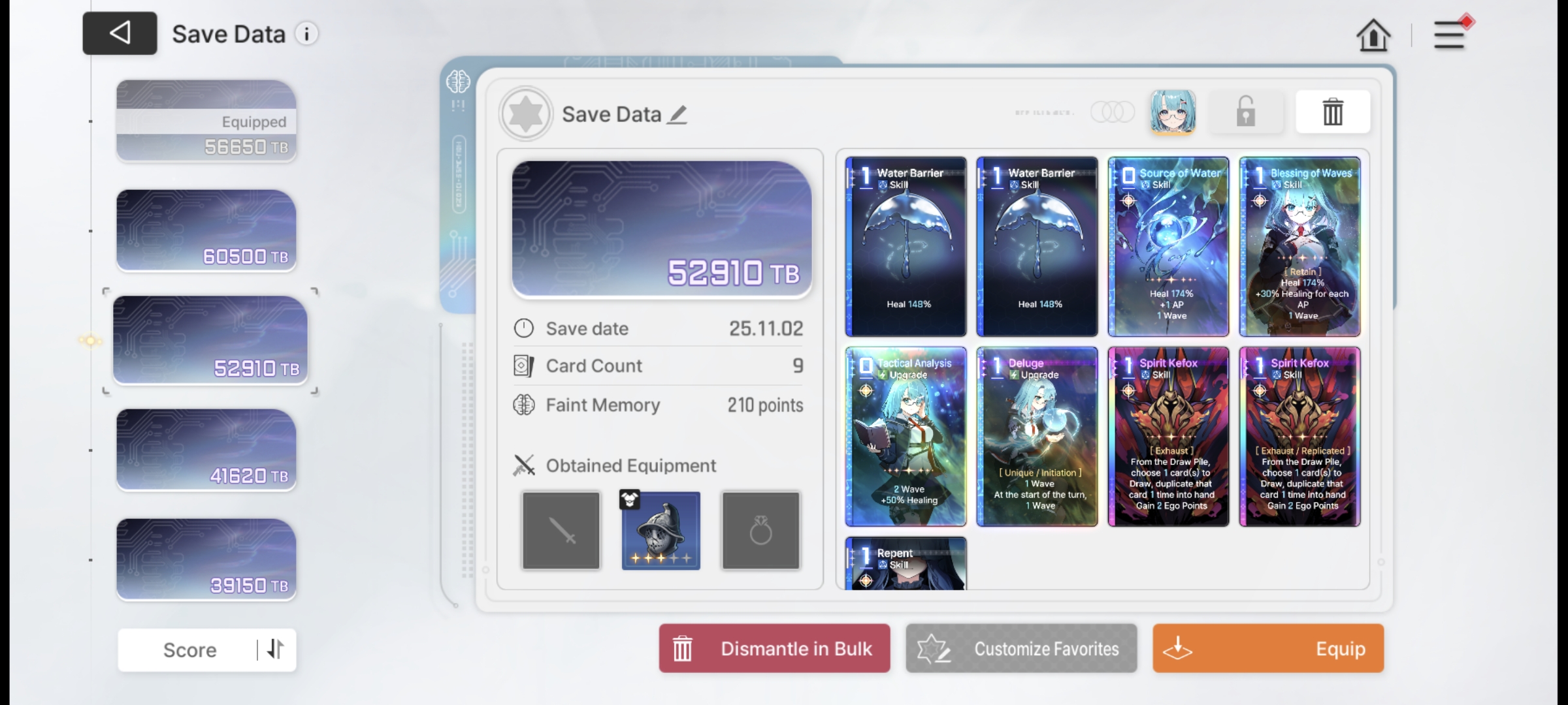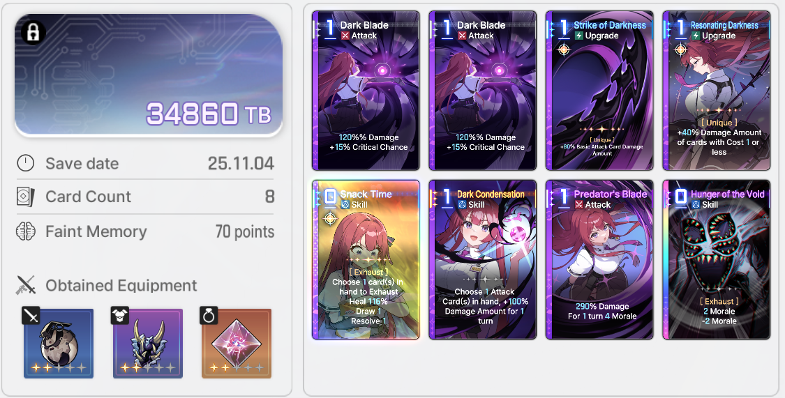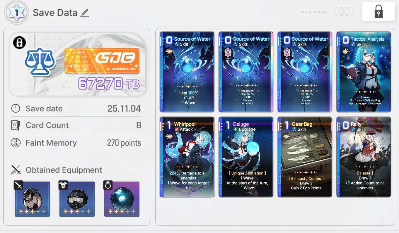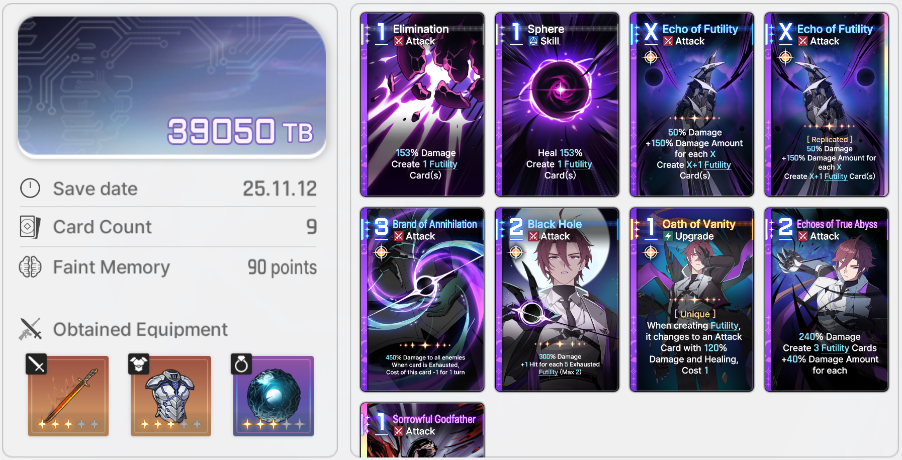 Save Card CalcsReminder that if your save is higher than the tier cap, the game will randomly delete or replace one of your cards with a basic card until the number drops to the tier capYou don't gain any points for gaining unique cards tied to your character.Neutral Cards = 20ptsMonster Cards = 80ptsRegular Epiphany= 0 points for Basic and Unique cards, +10pts for Neutral and MonsterDivine Epiphany = 20ptsCard Removal = 0pts for the first card, then +10/30/50/70. Also +20 if it's a basic cardDuplication = 0pts for the first time, then +10/30/50/70. Also add 10/20 for epiphany Convert = 10pts. Plus points for epiphany Forbidden card = 20pts but saved 100% of the timeYour save cap is basically 30+Your tier. That's basically it