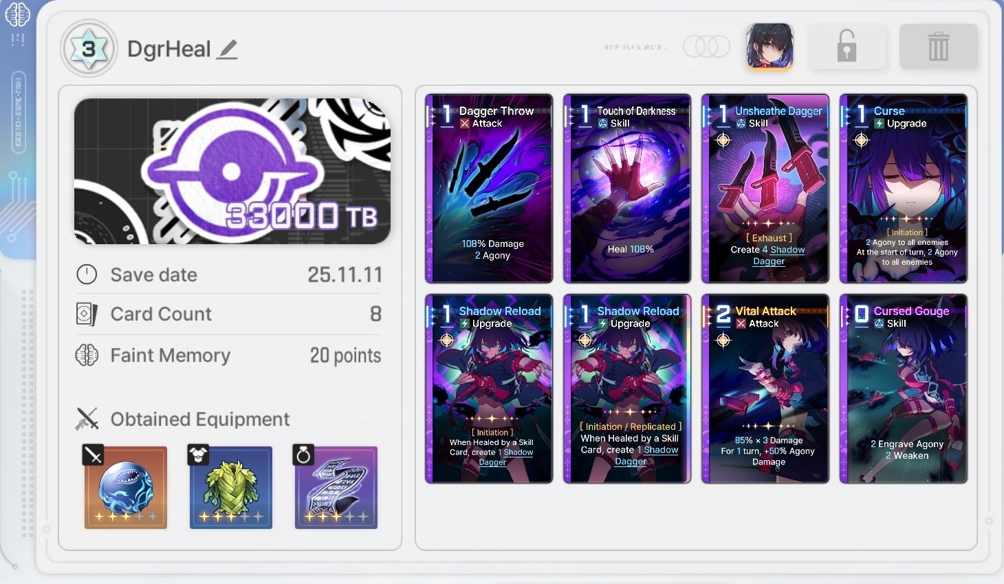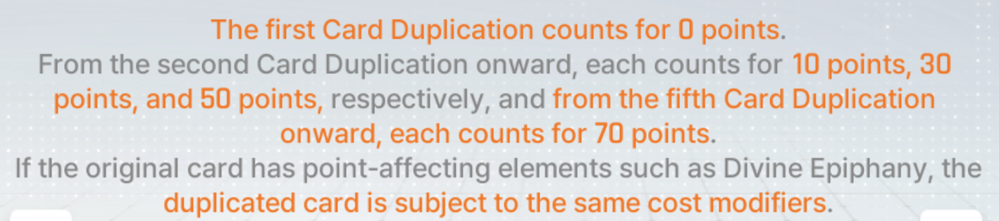 >>546249036>Regular Epiphany= 0 points for Basic and Unique cards>Card Removal = 0pts for the first card, then +10/30/50/70. Also +20 if it's a basic card>Duplication = 0pts for the first time, then +10/30/50/70. Also add 10/20 for epiphanyguess that's why building mei lin is so easy thenremove her shield it's +20, then remove her flying kick it's just +10 for 30 totaldupe epiphany unity is 20 or 40 depending on the # of dupesthat's 50~70 points for a near complete build, w/o divsif you div her unity, then just keep her flying kick to have som extra room