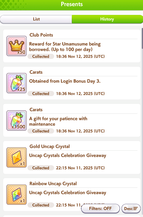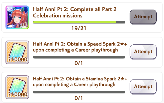 Previous: >>546272981>Global Game NewsCurrent Scenario: Aoharu Hai aka "Unity Cup"Current Specials Missions: Half Anniversary Part 2+3Current Rate Up: Hishi Akebono (3*) Matikanefukukitaru (3* Alt), Biko Pegasus (SSR), Sakura Bakushin O (SSR), Riko Kashimoto (SSR), Rice Shower (SSR)11/11 - Balance Adjustments AKA Umamusume 2https://umamusume.com/news/100040/https://pages.snep.pw/uma/anni-skill-changes/11/13 - Legend Races11/16 - VIRGO CUP - Hanshin 1600m11/24 - Story event>JP Game NewsCurrent Rate Up: Wonder Acute alt (3*), SSR Mihono Bourbon (Power)New Scenario "Yukoma Hot Spring" releasedTimeline: https://uma.moe/timeline>IP NewsUmamusume Cinderella Gray 2nd season started weekly airings on 10/5>Thread Clubshttps://rentry.co/umaglobalclublistYou must be E3 (20k points) to join a circle. Apply with /uma/ or /vg/ in your profile or post ID in the thread.>All Guides & Resourceshttps://rentry.org/uma26Game databasehttps://gametora.com/umamusume (Click the gear to switch between JP / global server info)A basic guide for newfagshttps://rentry.org/umaglobalFind networks if your region is blocked from the game or clienthttps://www.umavpn.top/93Seiyuu & Concertshttps://rentry.org/umst/uma/ POG (Paper Owner)
