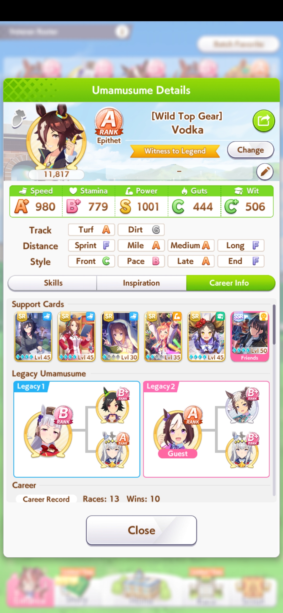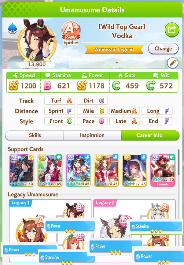 I can't decide what kind of borrowed legacy to look for for Taki. Is there a particular unique that I'd want to inherit? I know Brian's is pretty good, but her affinity with Taki is 8. IDK shadow Break is really worth using her as the parent.I might just ignore green sparks altogether and focus on affinity and URA sparks.