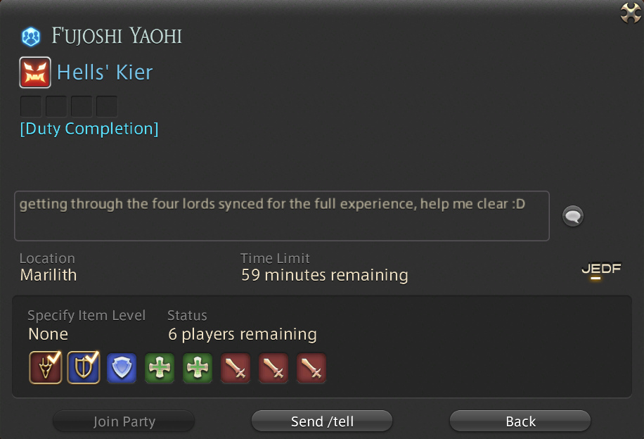 helloplease join my friend in hells' kier on dynamis so she can progress the four lords questlinethank you