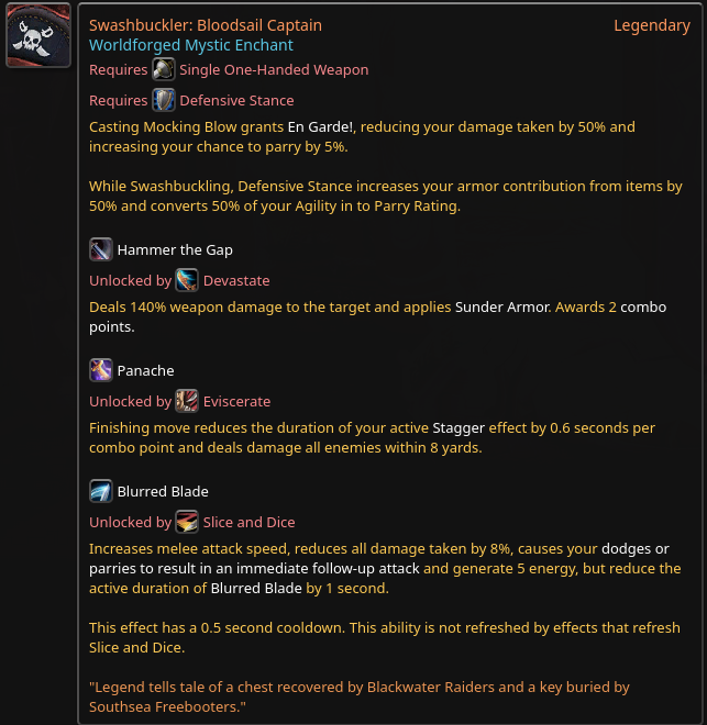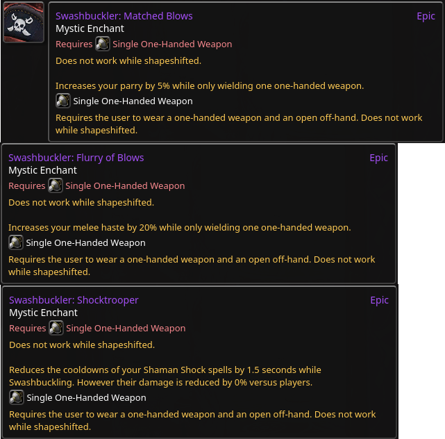 >>546470836basically just copies of dnd dueling feats except for the shock one which is faggot shit by default because of the arbitrary pvp restriction.one handed weapon only/dueling style doesn't work in wow because dueling almost has to have a defensive element to differentiate itself from other weapon configurations, but the only role for which defense matters at all in wow is tanking. And it would be pretty retarded to have a swashbucking duelist as a tank.