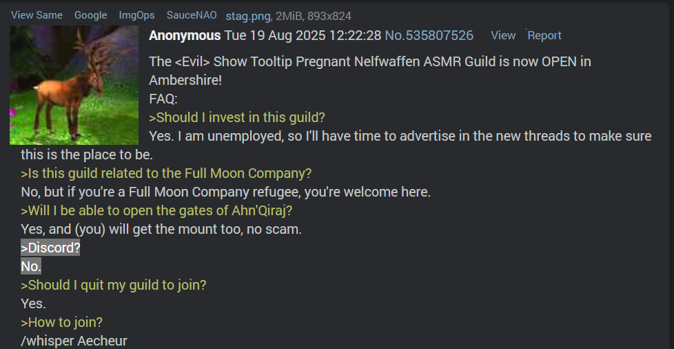 >>546673752>cross faction guildsis there a feasible way to make cross faction work lore wise without also resorting to lets all hold hands bullshit like in retail?I was thinking you could have the player characters all come from factions that aren't formally part of the horde and alliance, like have player humans be part of the defias or be from defias controlled territory, have dwarves be wildhammers, night elves be actual lore night elves that aren't part of the alliance. Then allow the players to enlist or be deputized by the alliance temporarily for pvp combat which is basically just war mode. In other words while you are formally part of the alliance military as a mercenary or whatever you are a legitimate target to horde forces meaning you are flagged for pvp, but when you end your service it's like playing a pve server. And you also when not enlisted are able to form groups with nominally horde aligned races.The horde equivalents could be groups of disparate orcs that haven't fully joined with thrall, various troll tribes and the tauren work by default here I think. It would even work better for the forsaken to be this loosely aligned faction rather than formally part of the horde politically. The most difficult one to make it work for is humans and orcs. Maybe instead of defias for humans make players come from the human kingdoms less aligned to stormwind like gilneas, alterac etc.