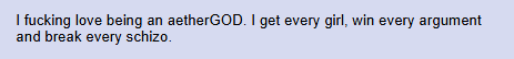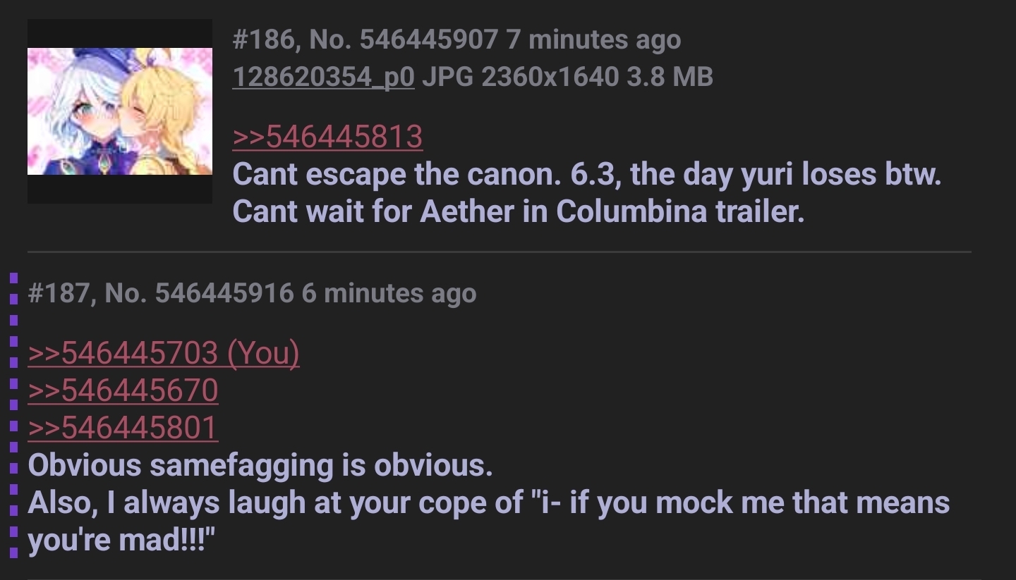 Aether? Not a harem MC.Genshin? No self insert pandering.The Aether spammer on /gig/? Fantasizes about men's' assholes.